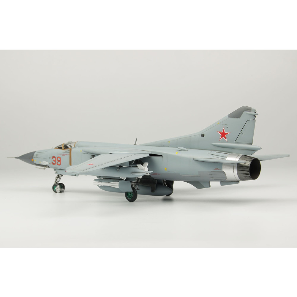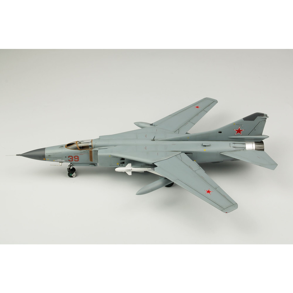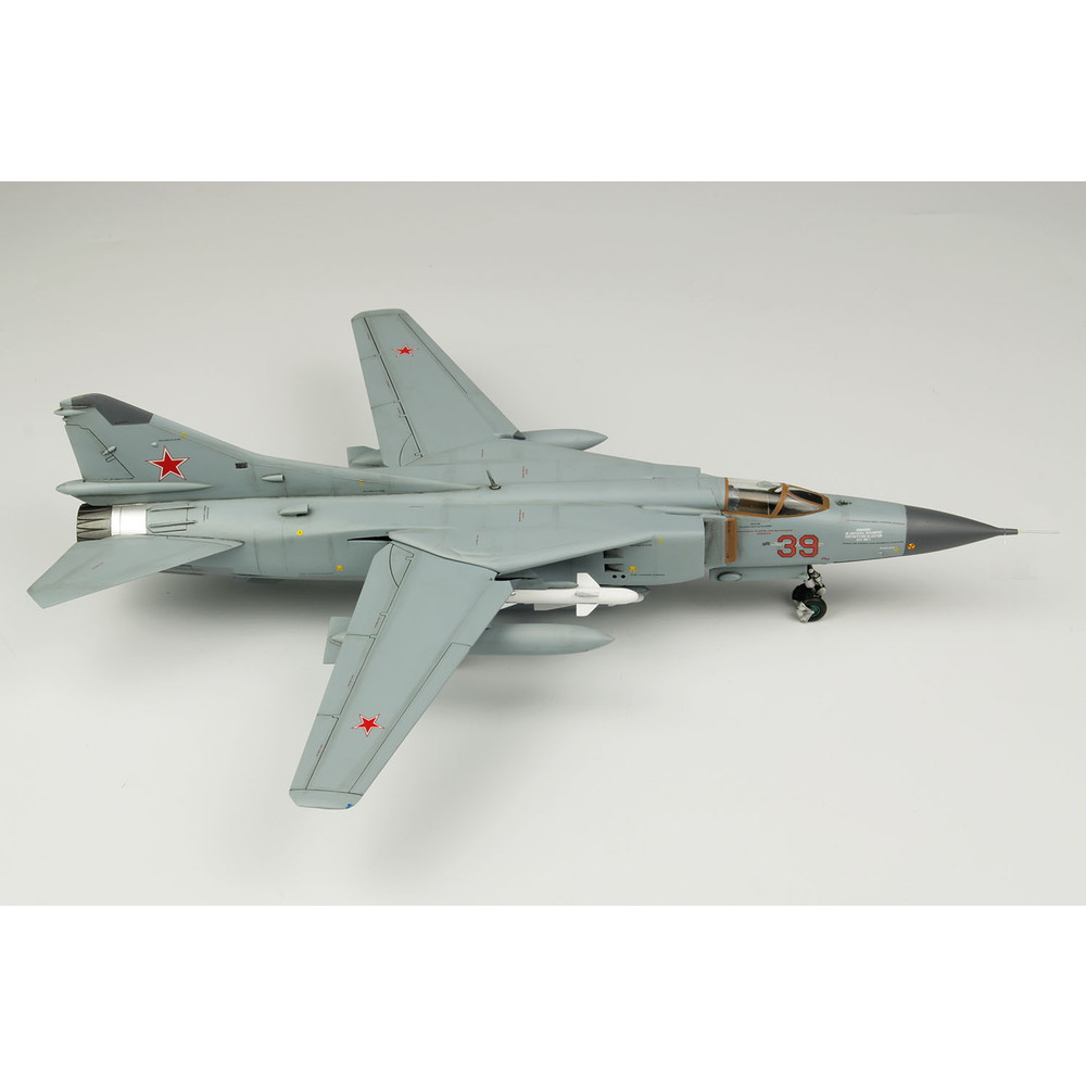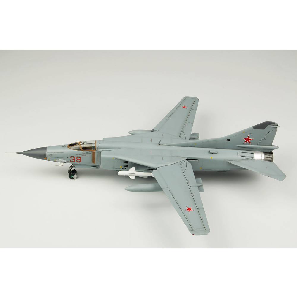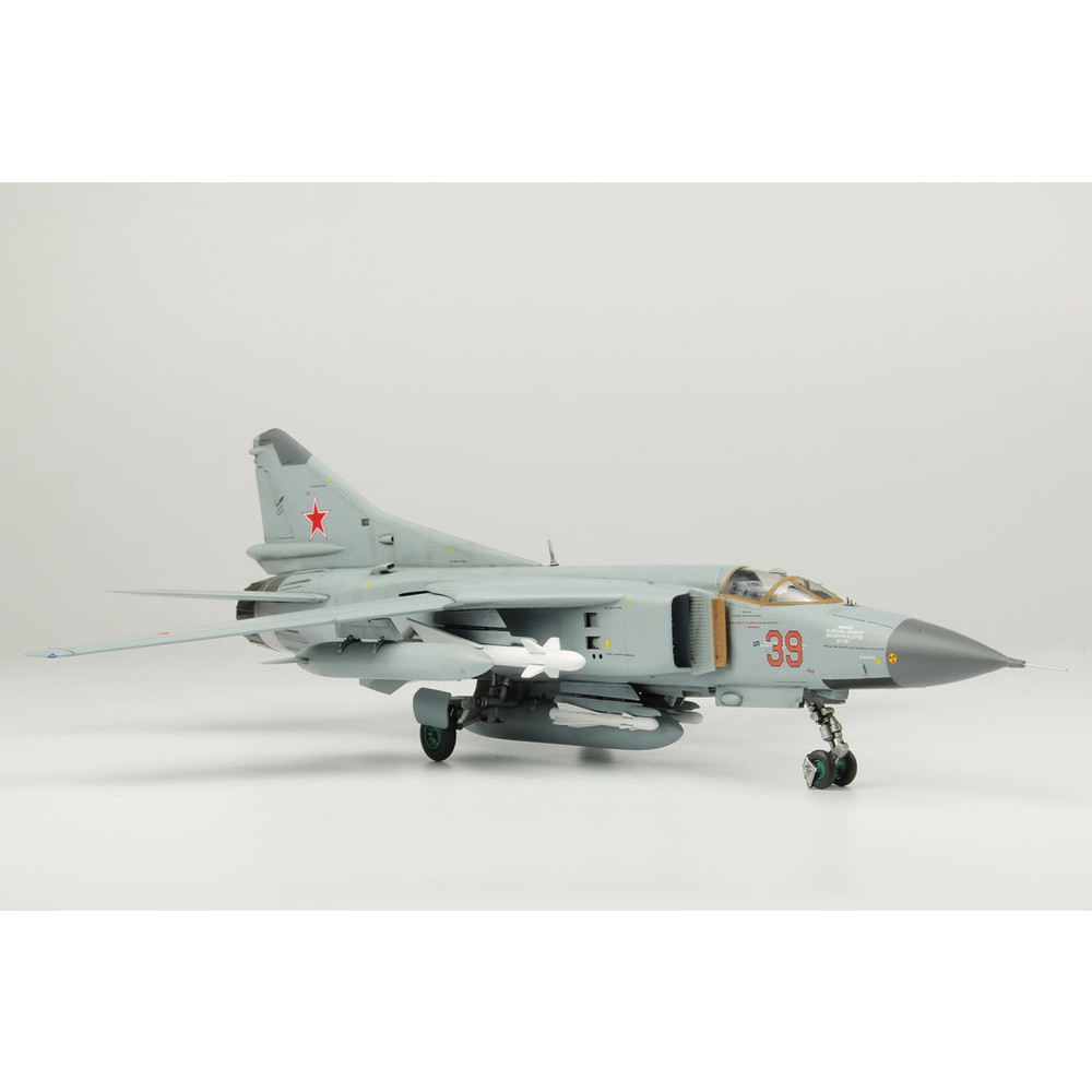 1970年代以降、ソ連とその周辺国の主力戦闘機となった可変翼戦闘機、MiG-23MFフロッガーBです。MFタイプをモデル化し、スケールは1/48、仕上がり全長は35.2cm。実機と同じようにモデルも可変翼は完成後も開閉の可動が楽しめます。