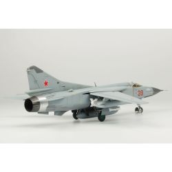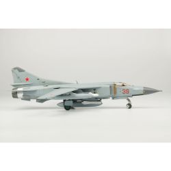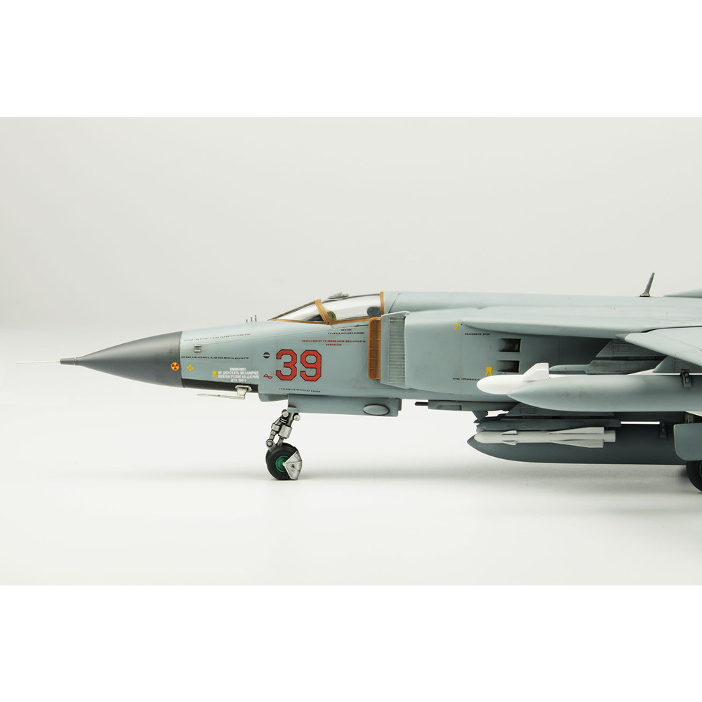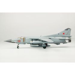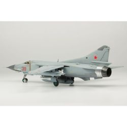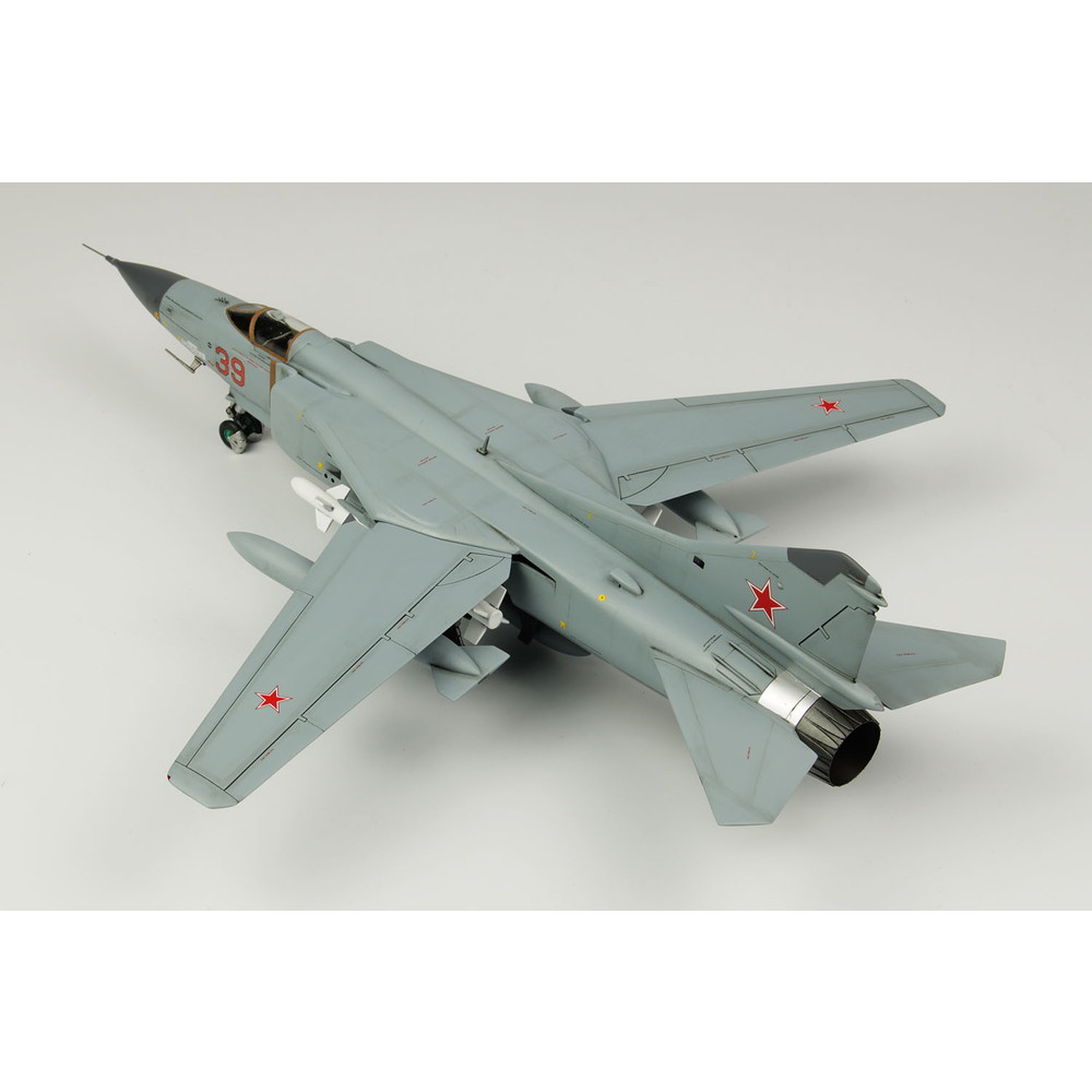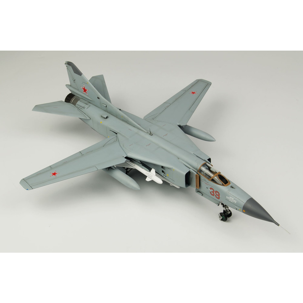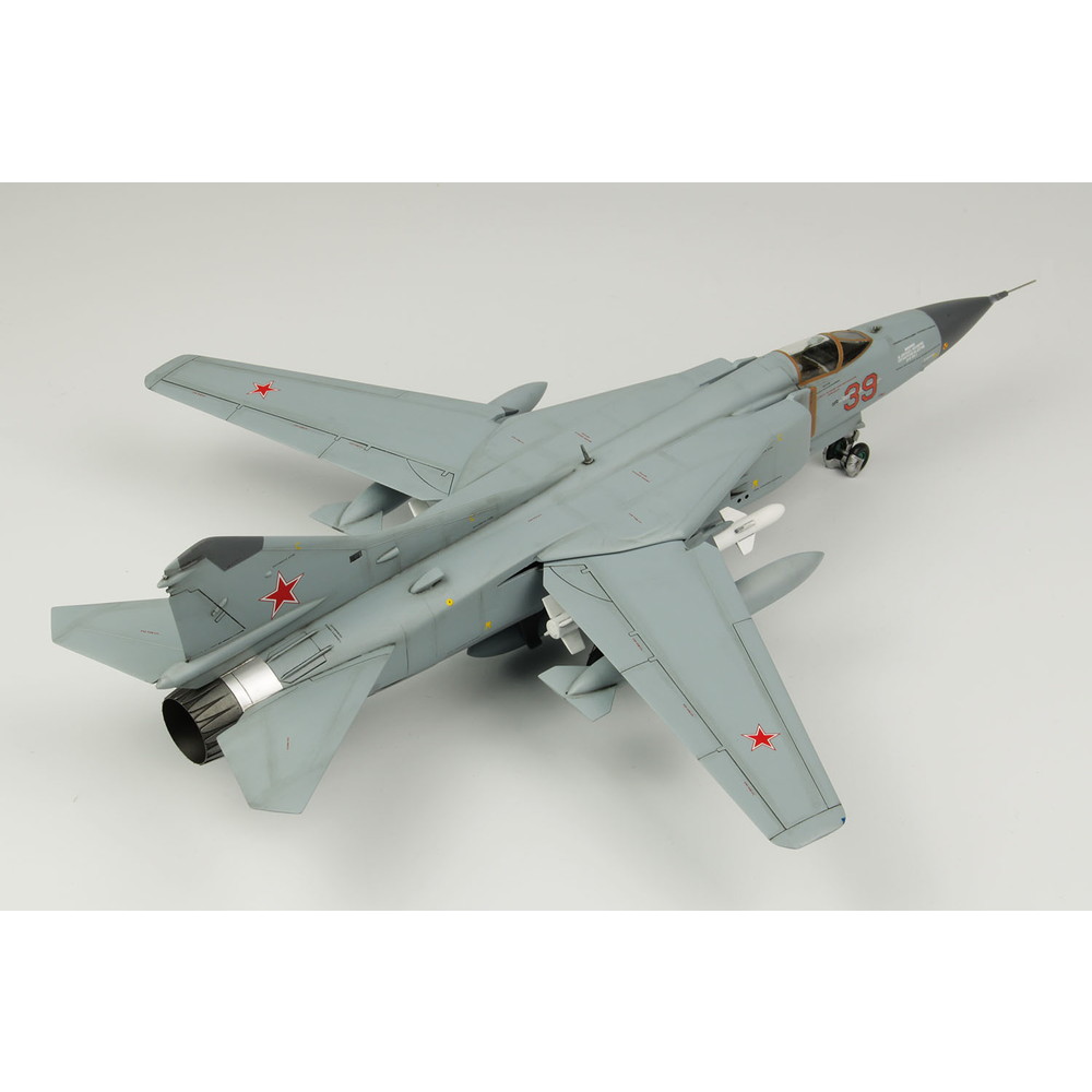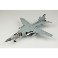 1970年代以降、ソ連とその周辺国の主力戦闘機となった可変翼戦闘機、MiG-23MFフロッガーBです。MFタイプをモデル化し、スケールは1/48、仕上がり全長は35.2cm。実機と同じようにモデルも可変翼は完成後も開閉の可動が楽しめます。