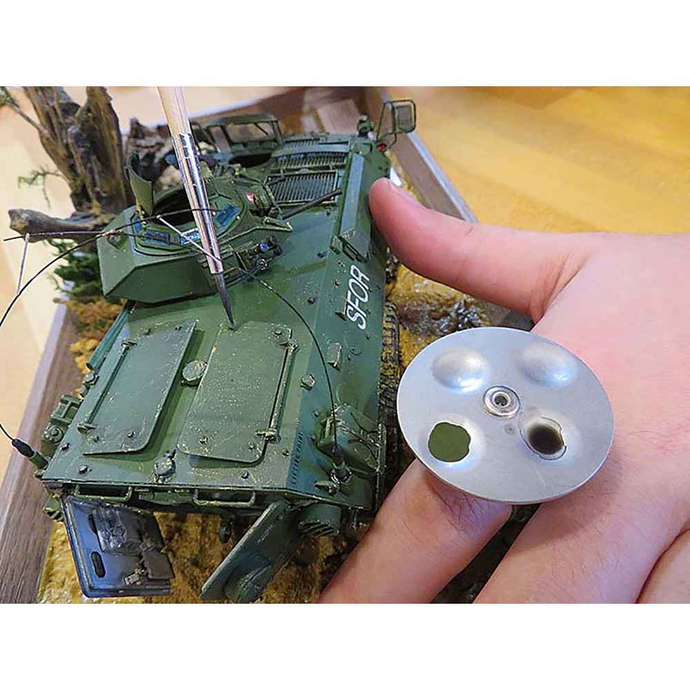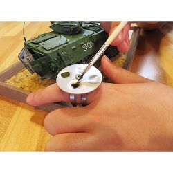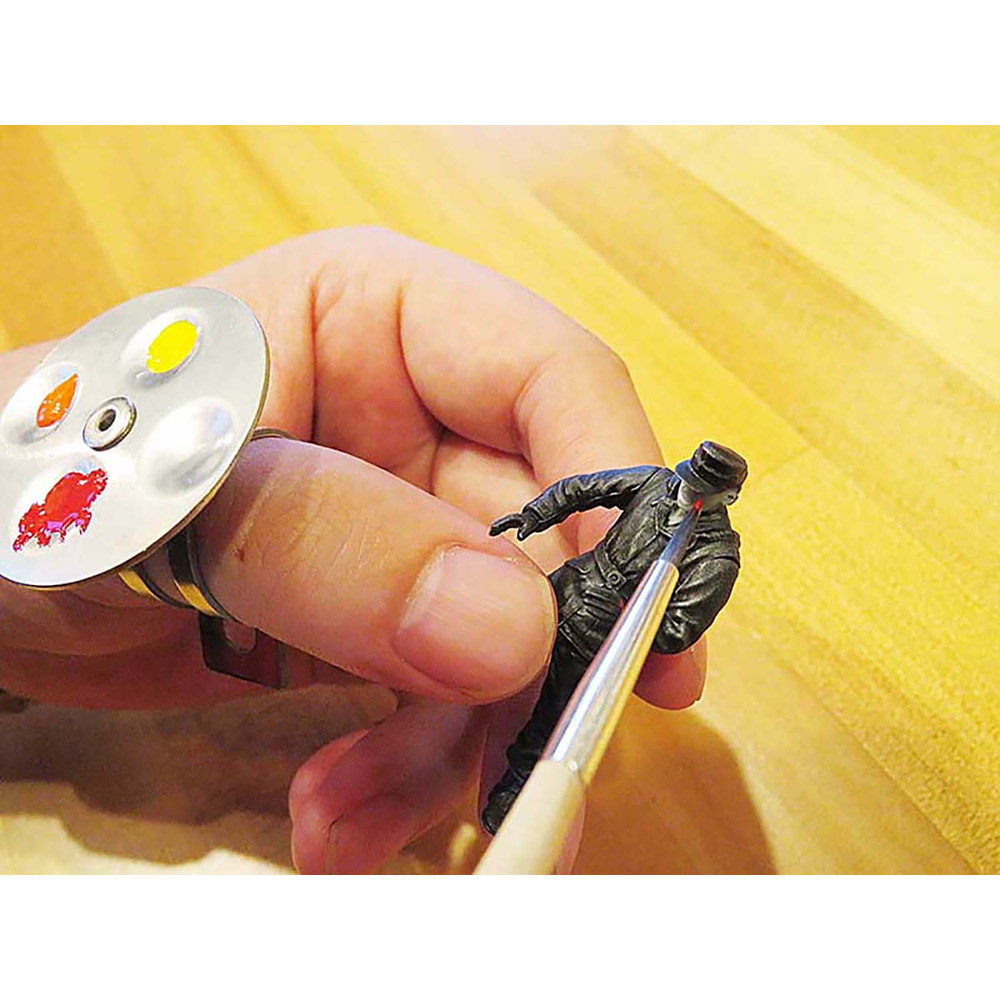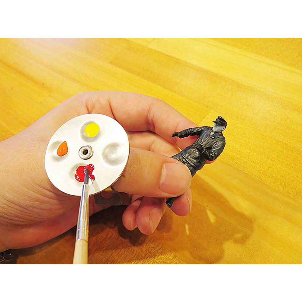 特に細筆による細部の筆塗り塗装で作業がはかどります。直径38mmのベースに塗料を入れる4つの円形の小さなくぼみが作られたパレットです。