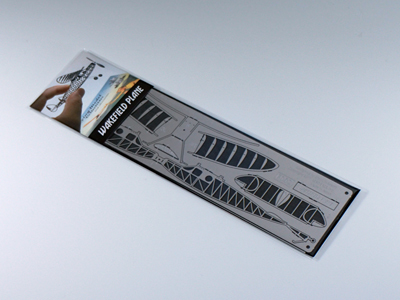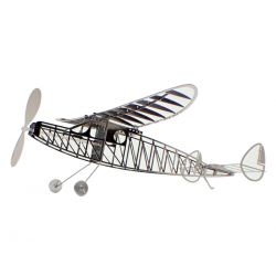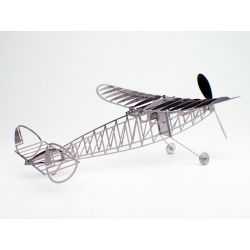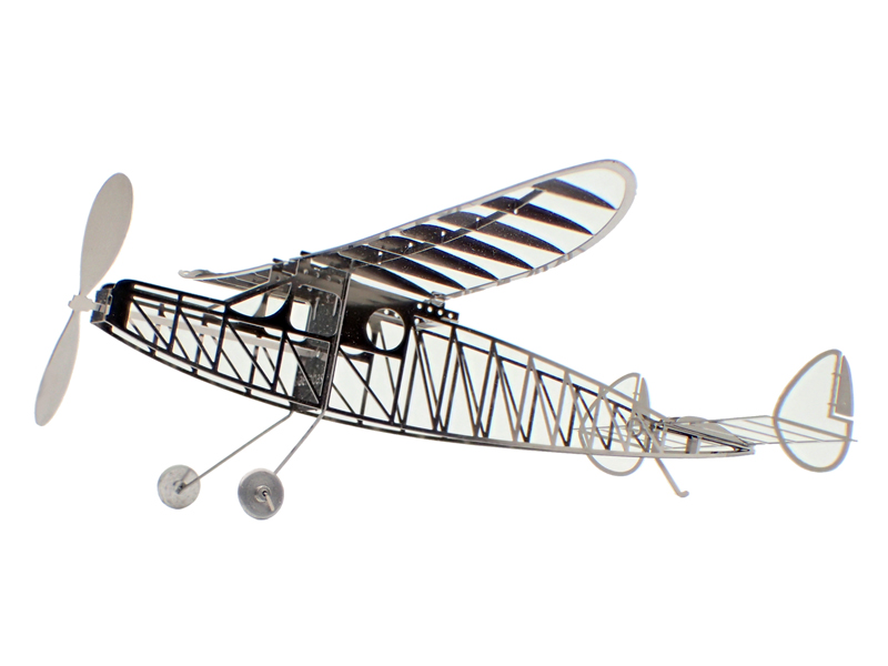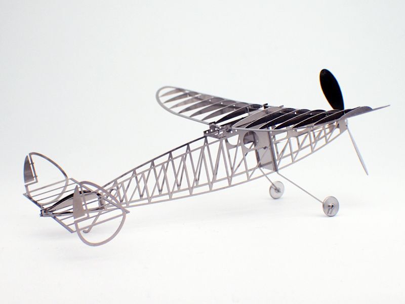 モデルはアメリカで昔開催されていたゴム動力模型飛行機大会で活躍していたゴム動力のフリーフライト機を再現しています。機体に竹ひごや朴の木、バルサなどを使用。機体に装備したゴムを巻いてそれを動力に飛ばす模型飛行機をモデル化しています。胴体はもちろん、主翼は外周と内側のリブをエッチングパーツでモデル化。翼リブを直角にひねるだけで立体的な翼が完成します。さらに、機体の形状だけでなく、タイヤはアルミ製パーツで形状を再現。実際に飛行させることはできませんが、息を吹きかけると回転するプロペラが大空を飛ぶ姿を想像させます。