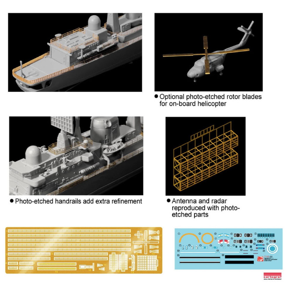 手すりなどのエッチングパーツもセット。さらに、キットには艦載ヘリコプター、ウエストランド・リンクスもモデル化されています。
