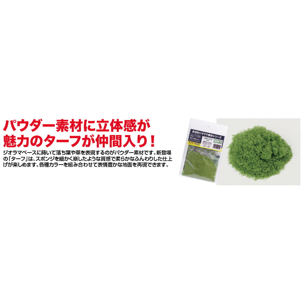 ジオラマベースに蒔いて地面に様々な表情を手軽につけることができます。スポンジを細かく崩した粒状の素材で蒔いたときの厚みを調整することで柔らかなふんわりした仕上げも楽しめます。