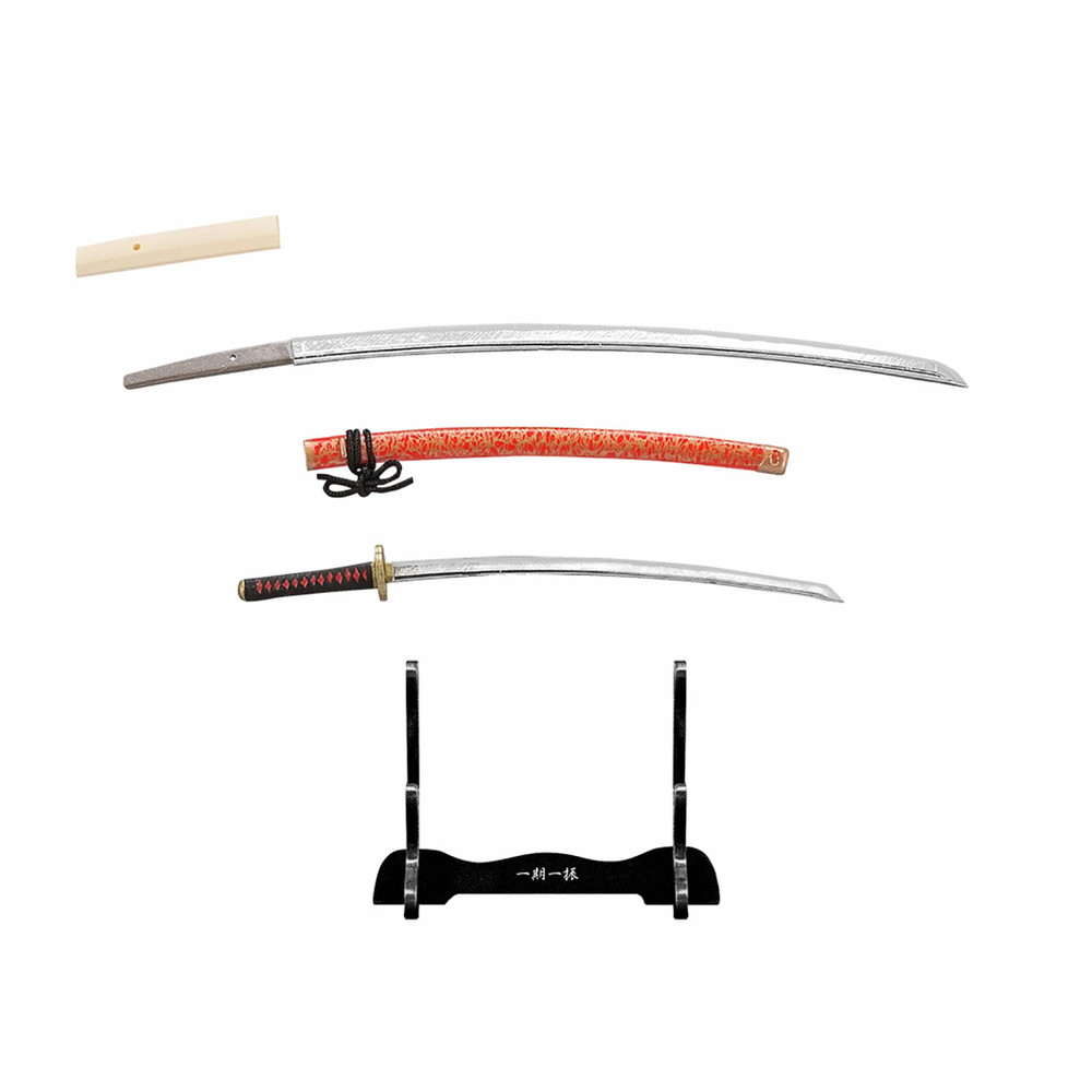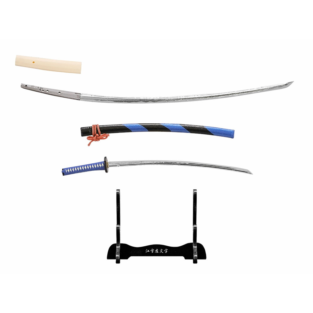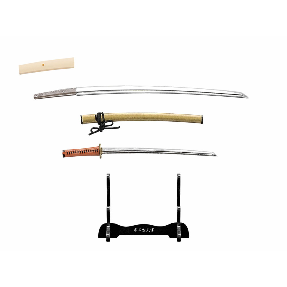 1/8スケールは刀身と白鞘のセット、1/12スケールは彩り豊かな拵違いでモデル化。付属の台座に飾ることができます。