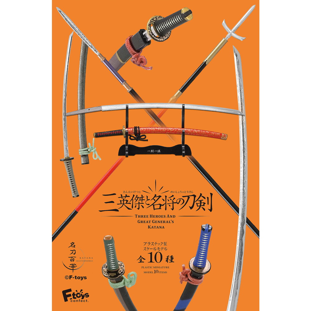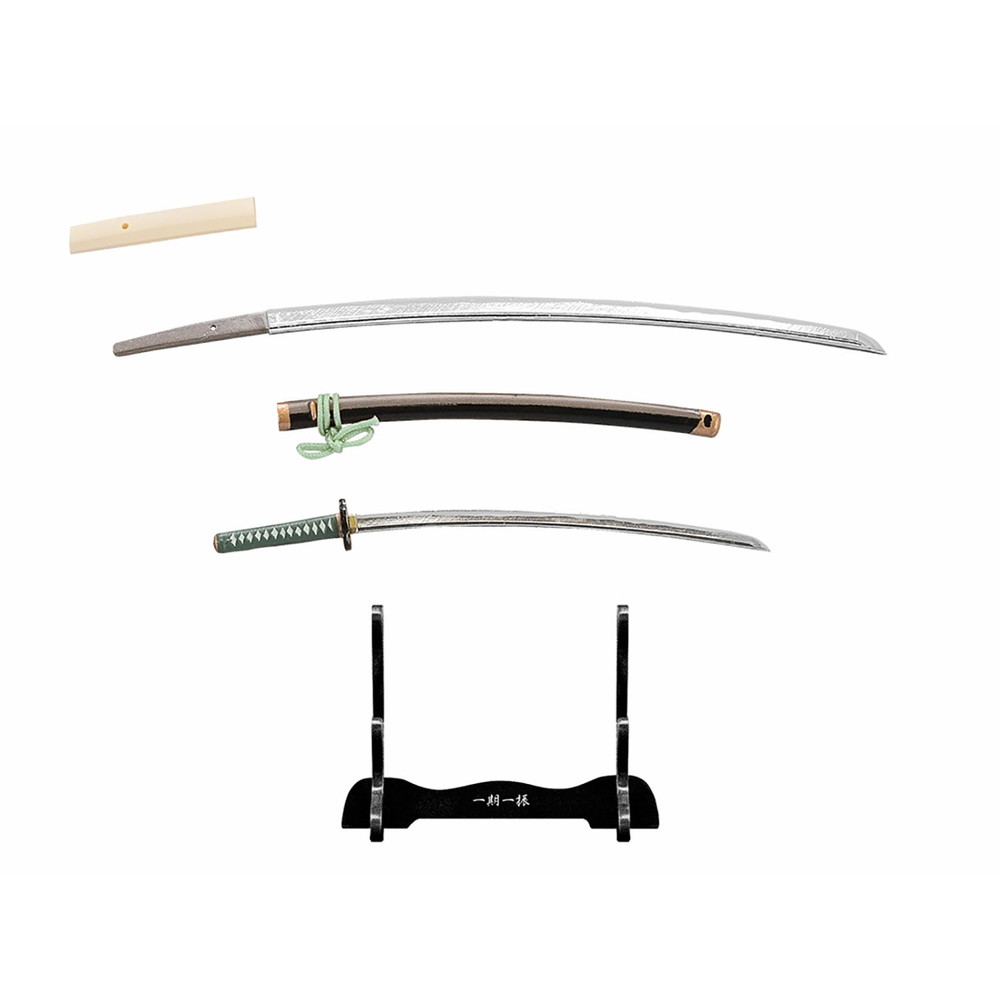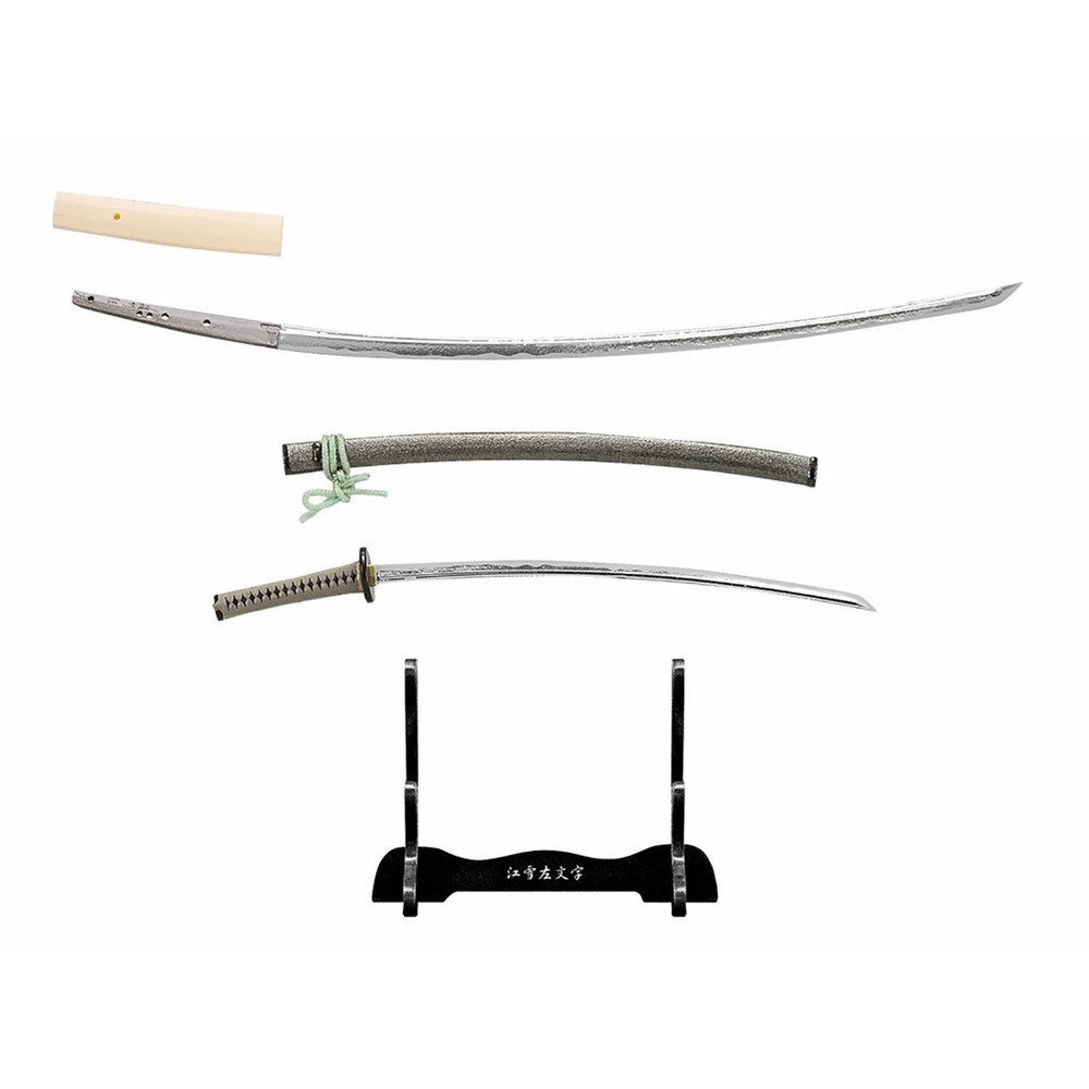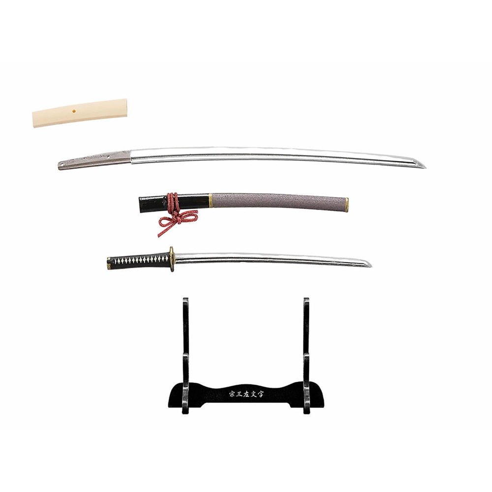 1/8スケールは刀身と白鞘のセット、1/12スケールは彩り豊かな拵違いでモデル化。付属の台座に飾ることができます。