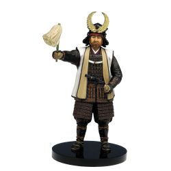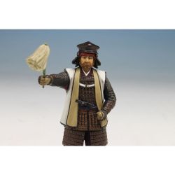 前に伸ばした右手は采配、または軍配を選んで持たせることが可能。さらに、顔も面頬をつけた状態と素顔を見せた状態を選んで組み立てていただけます。