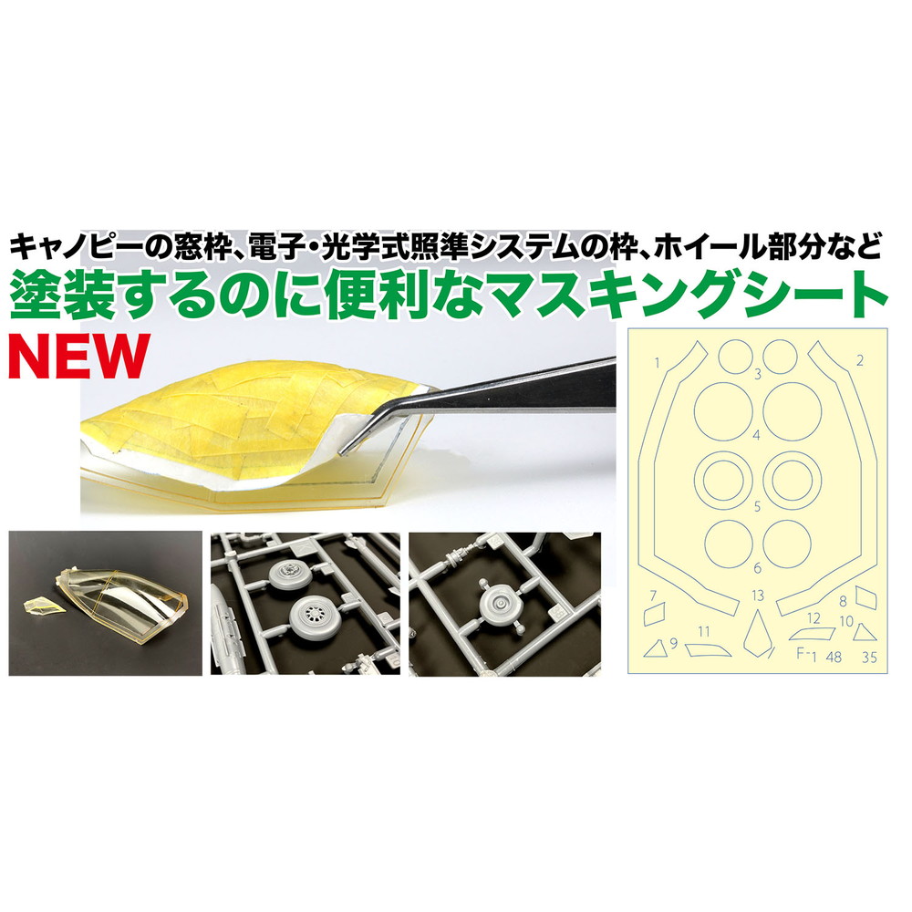 F-35BライトニングIIのキットのキャノピーの窓枠、および、機首下面に装備されている電子・光学式照準システムの枠の塗装用マスクシートに加えて、ホイール部分を塗装するためのマスキングシートを収録しています。