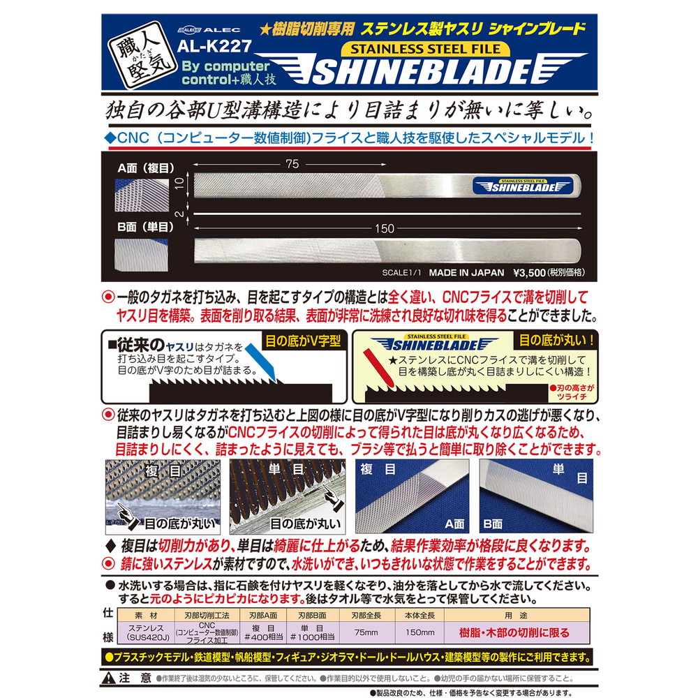 ※職人堅気 樹脂専用 ステンレス製ヤスリ シャインブレード 10(AL-K227)の発売に合わせ、職人堅気 ステンレス製ヤスリ シャインブレード(AL-K44)は廃盤となります。
