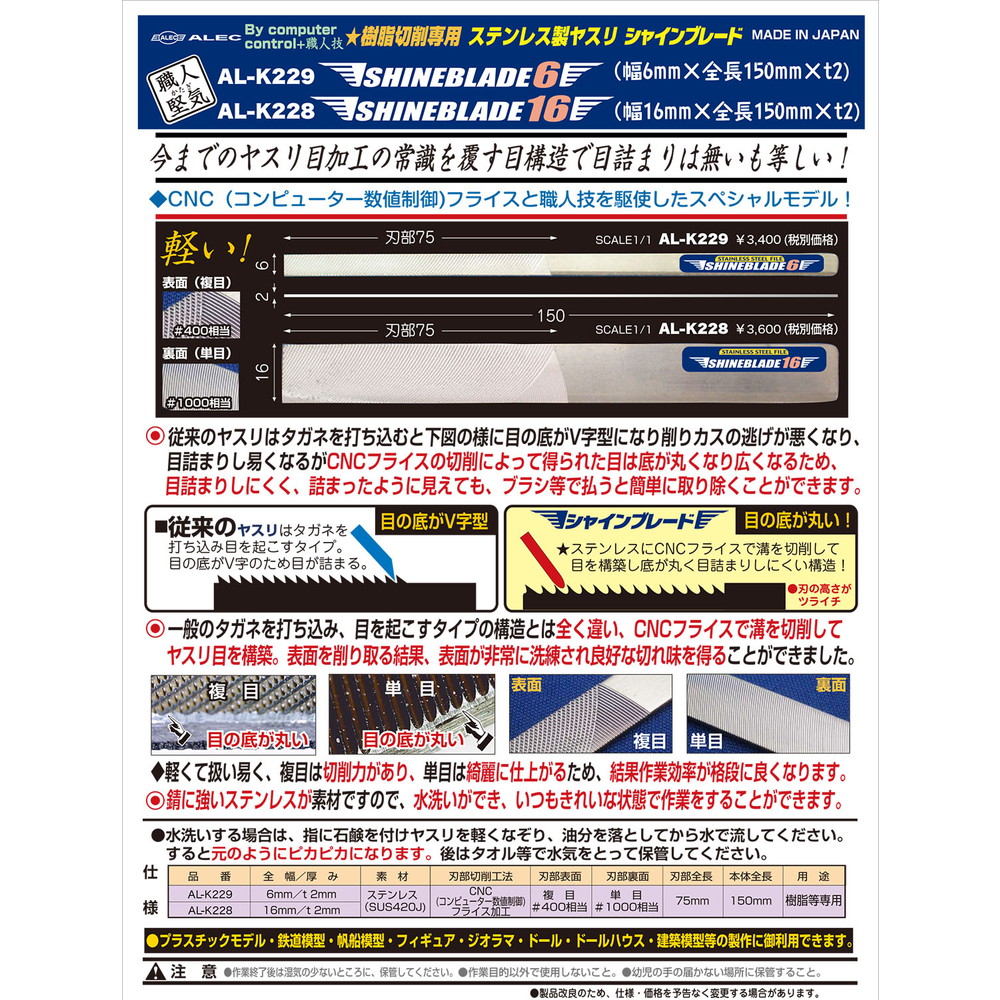 ※職人堅気 樹脂専用 ステンレス製ヤスリ シャインブレード 10(AL-K227)の発売に合わせ、職人堅気 樹脂専用ヤスリ シャイン ブレード W6(AL-K55)は廃盤となります。