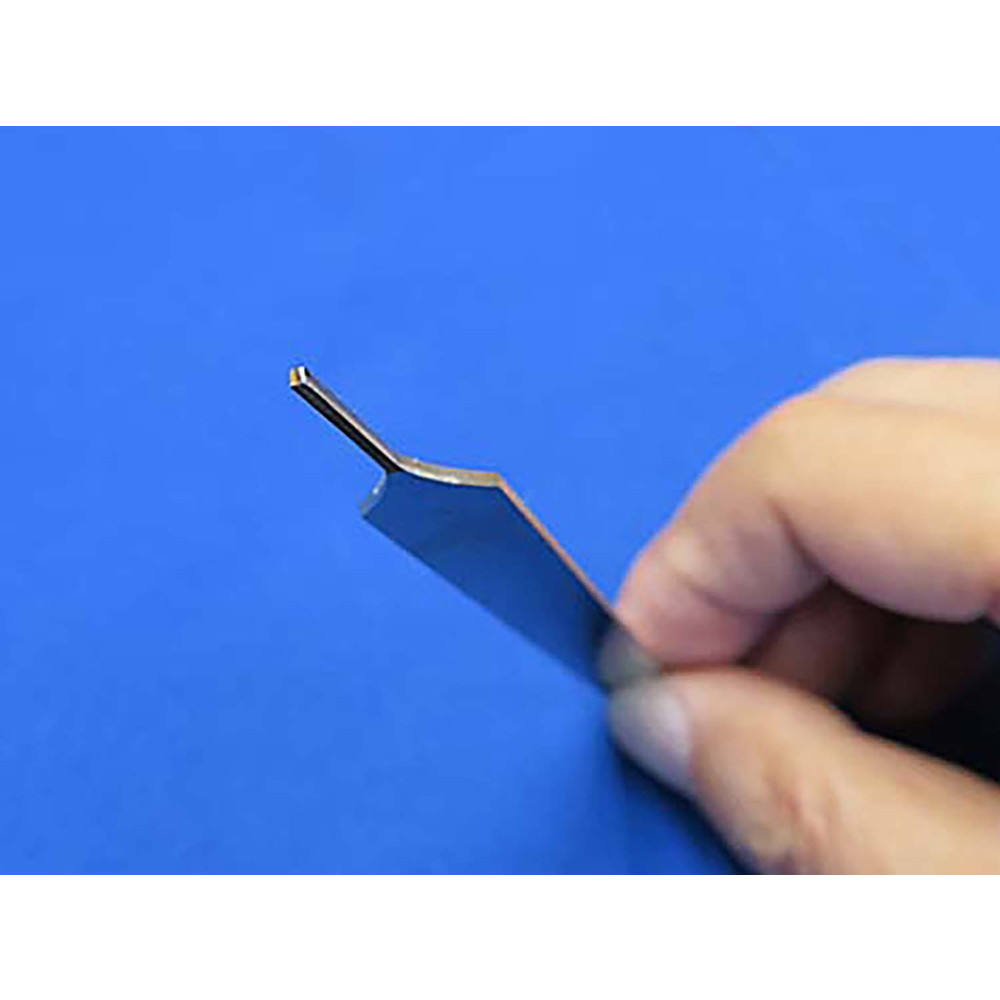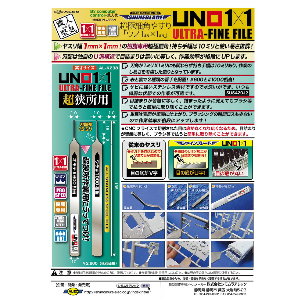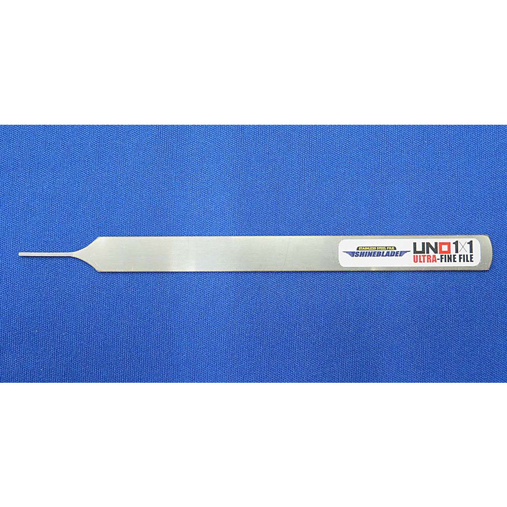 超狭所でのヤスリ作業を可能にした、ヤスリ幅1x1mmの樹脂専用超極細角やすりシャインブレードウノ1x1!!刃角は1x1mmで、持ち手幅は10mmと作業のし易さを考慮した構造。