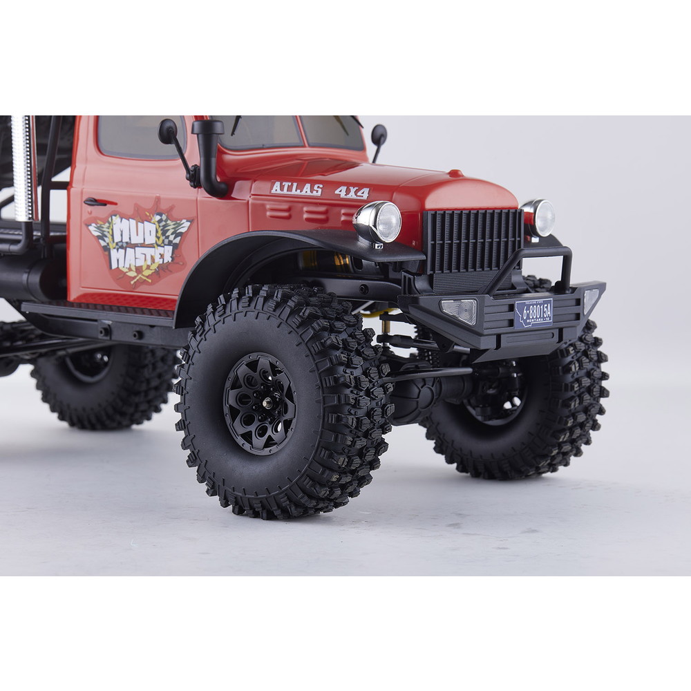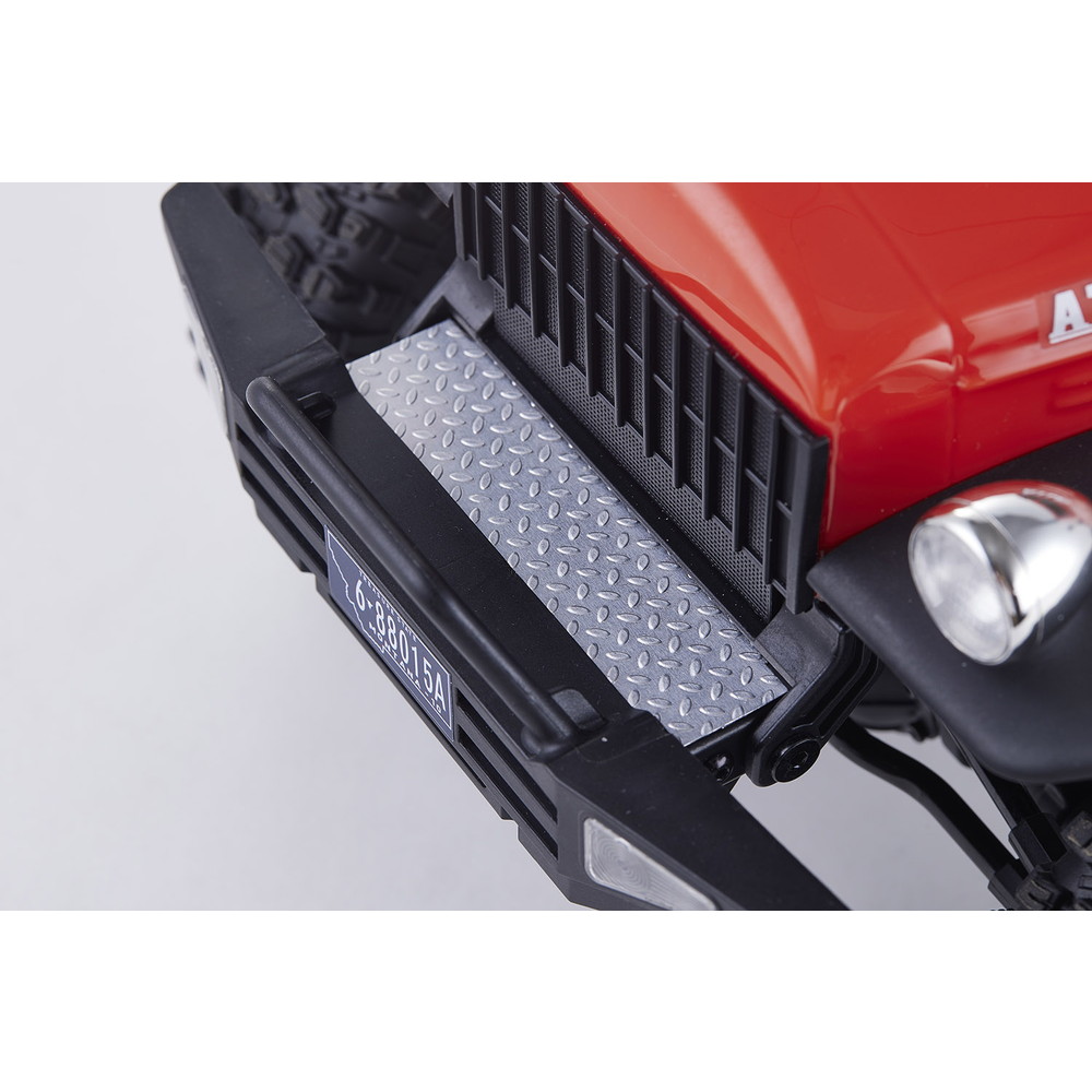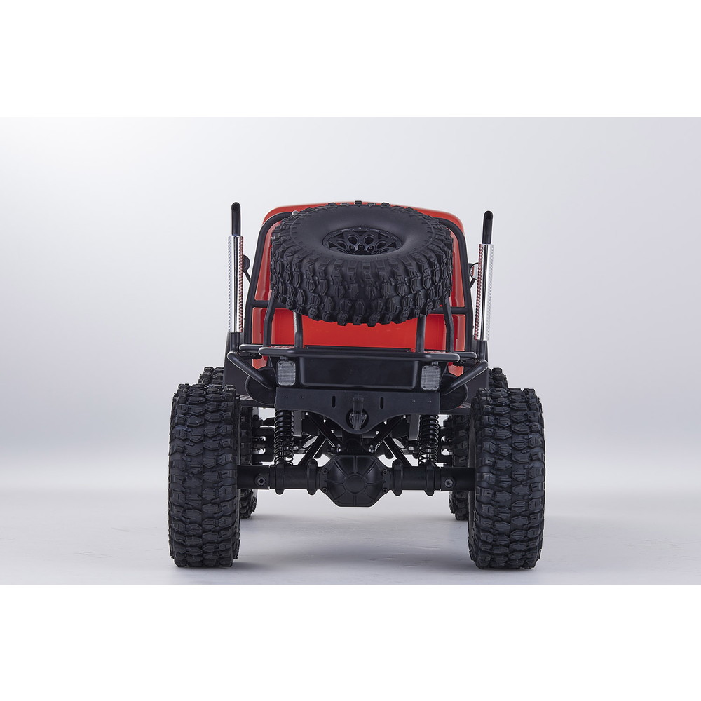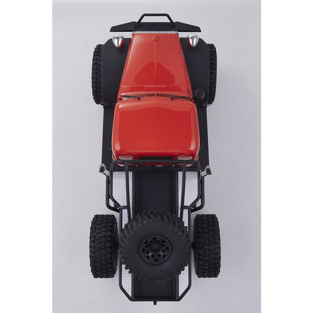 存在感あふれるサイズに電動RCでの走行メカニズムが詰め込まれています。タフな走りを可能にするメカニズムはシャフトドライブのフルタイム4WD。加えて直径12cm、路面をしっかりつかむブロックパターンのトレッドパターンを持つ大径タイヤと大胆にリフトアップされた4リンクサスペンションに金属製フレームと使用した専用シャーシを採用。
