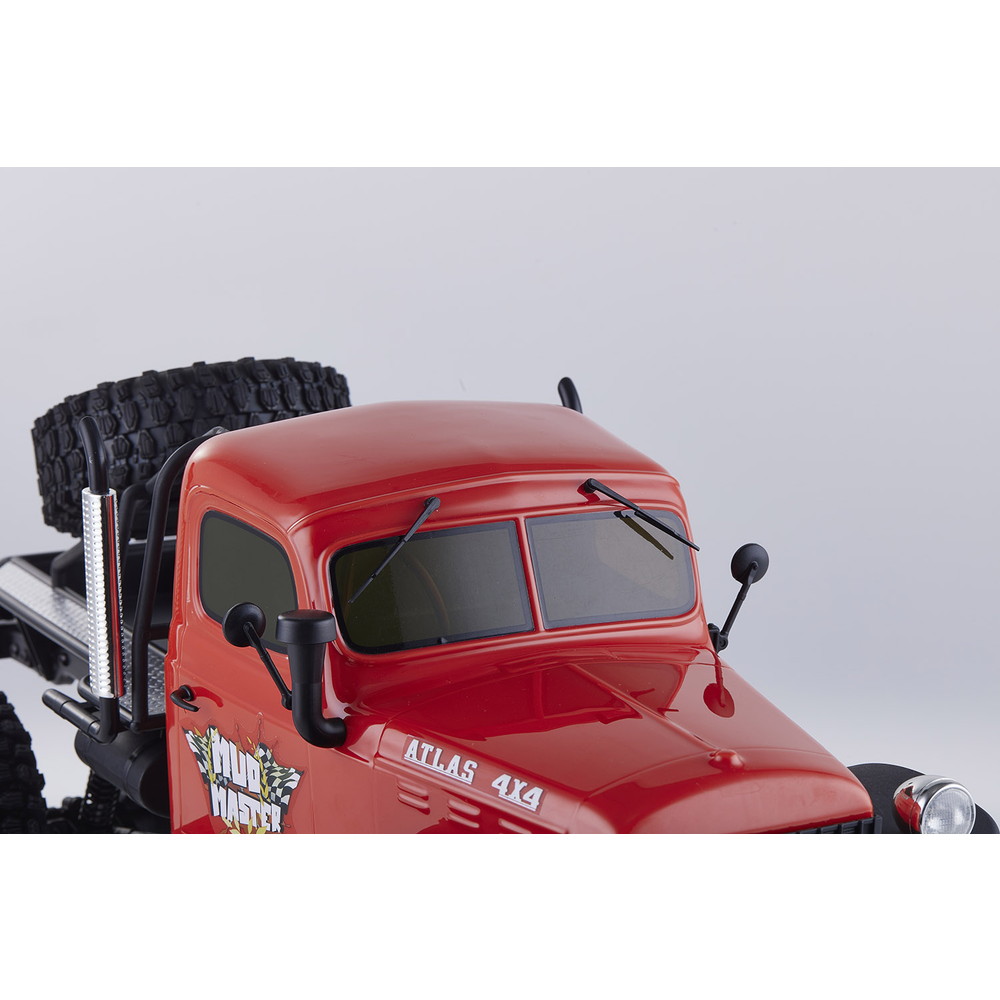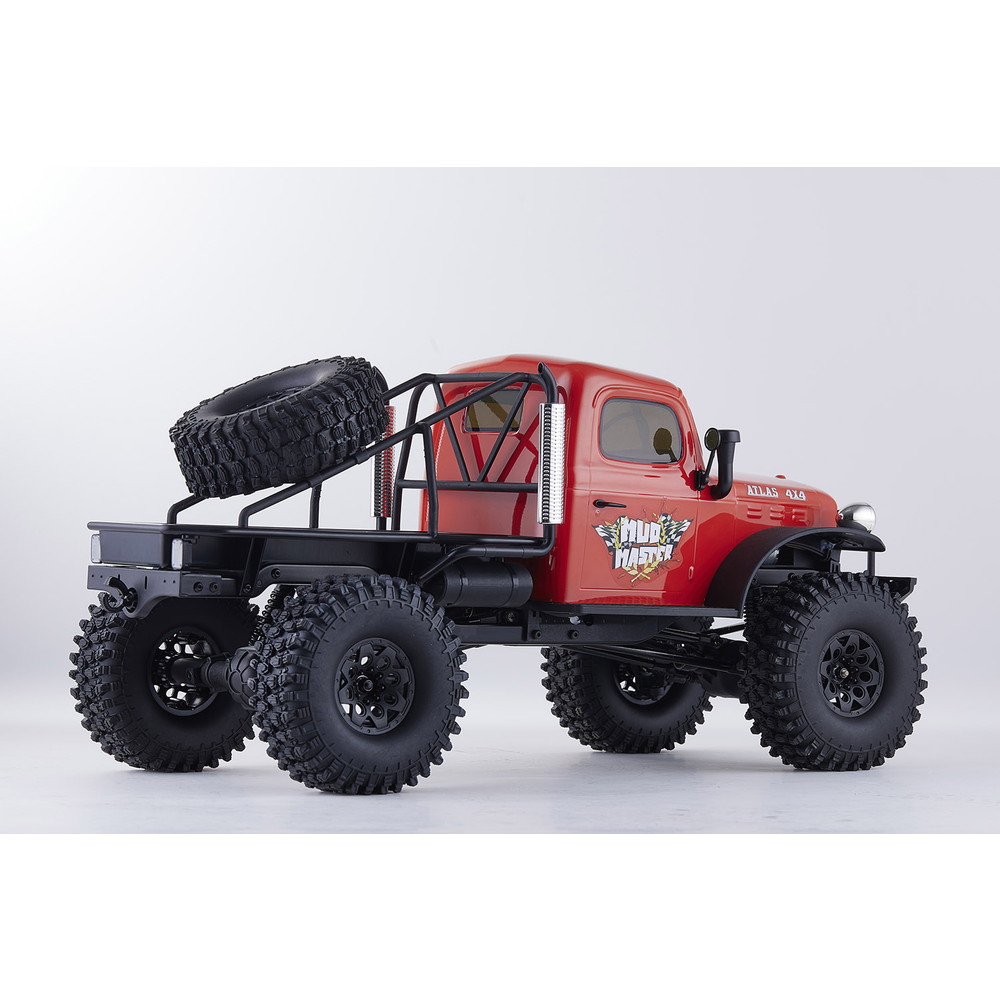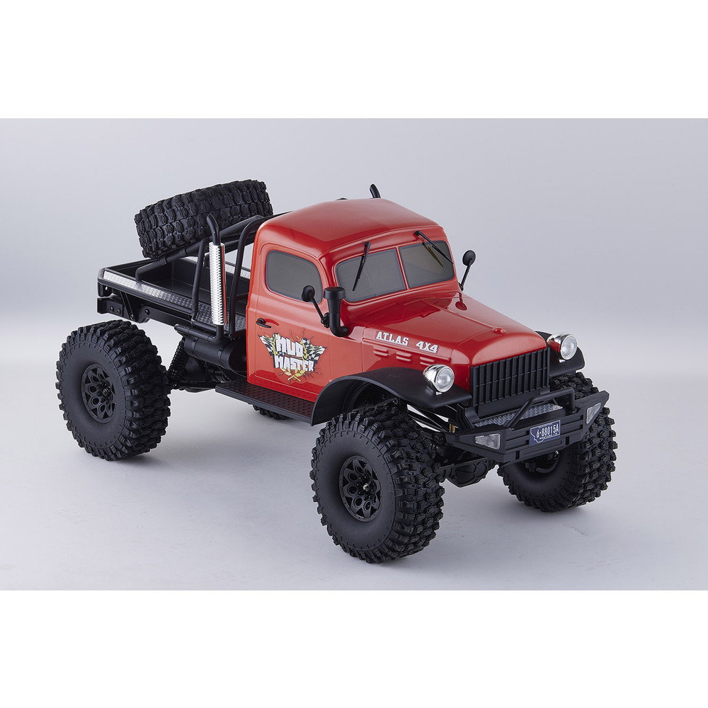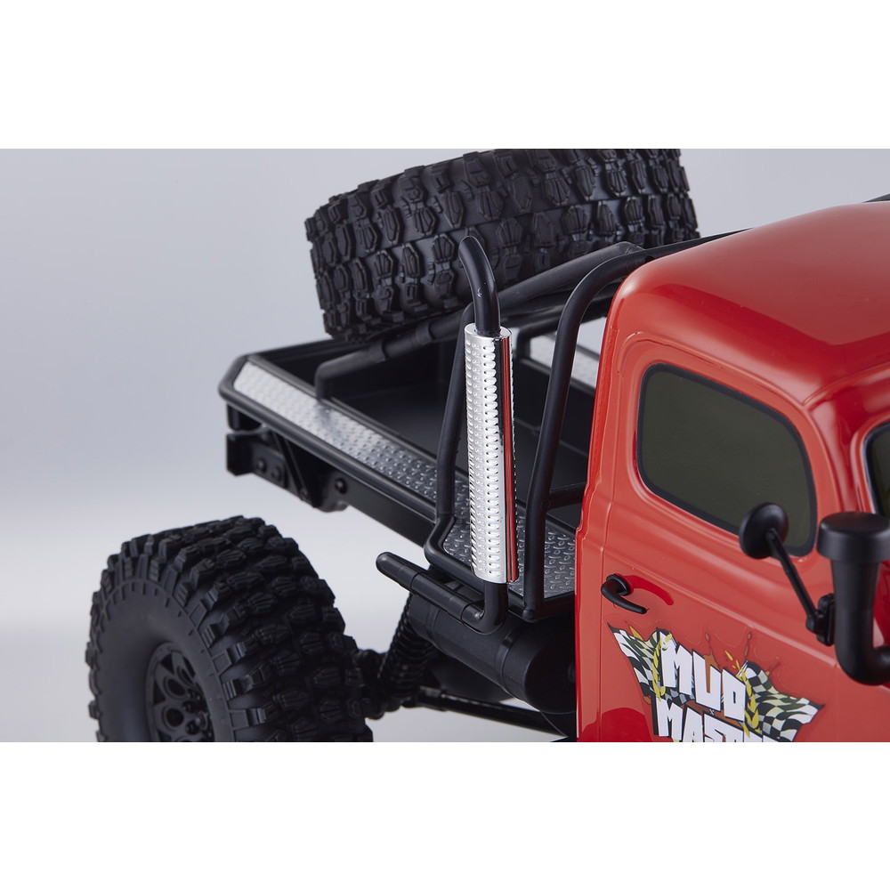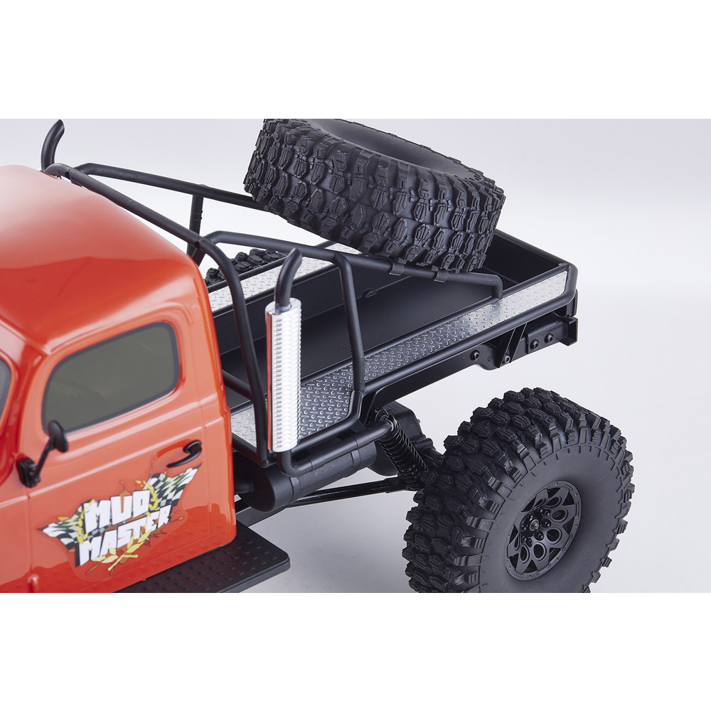 存在感あふれるサイズに電動RCでの走行メカニズムが詰め込まれています。タフな走りを可能にするメカニズムはシャフトドライブのフルタイム4WD。加えて直径12cm、路面をしっかりつかむブロックパターンのトレッドパターンを持つ大径タイヤと大胆にリフトアップされた4リンクサスペンションに金属製フレームと使用した専用シャーシを採用。