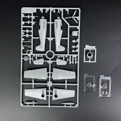 モデルは第二次大戦で活躍したアメリカ海軍の艦上戦闘機、F6Fヘルキャットを1/144スケールで再現。F6F-3Kタイプをモデル化しています。仕上がりの全長は72mmと手頃なサイズ。パーツ点数も抑えられた構成で組み立ても手軽です。ヘルキャットの力強いスタイルやパネルラインなども実機の雰囲気を捉えてしっかりと再現。脚などの繊細な再現も実感を高めます。また、胴体下に装備される補助燃料タンクも再現しています。