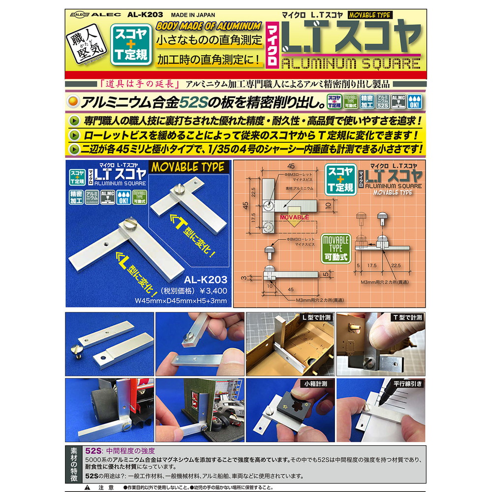 ローレットビスを緩めることによって従来のスコヤからT定規に変化可能。