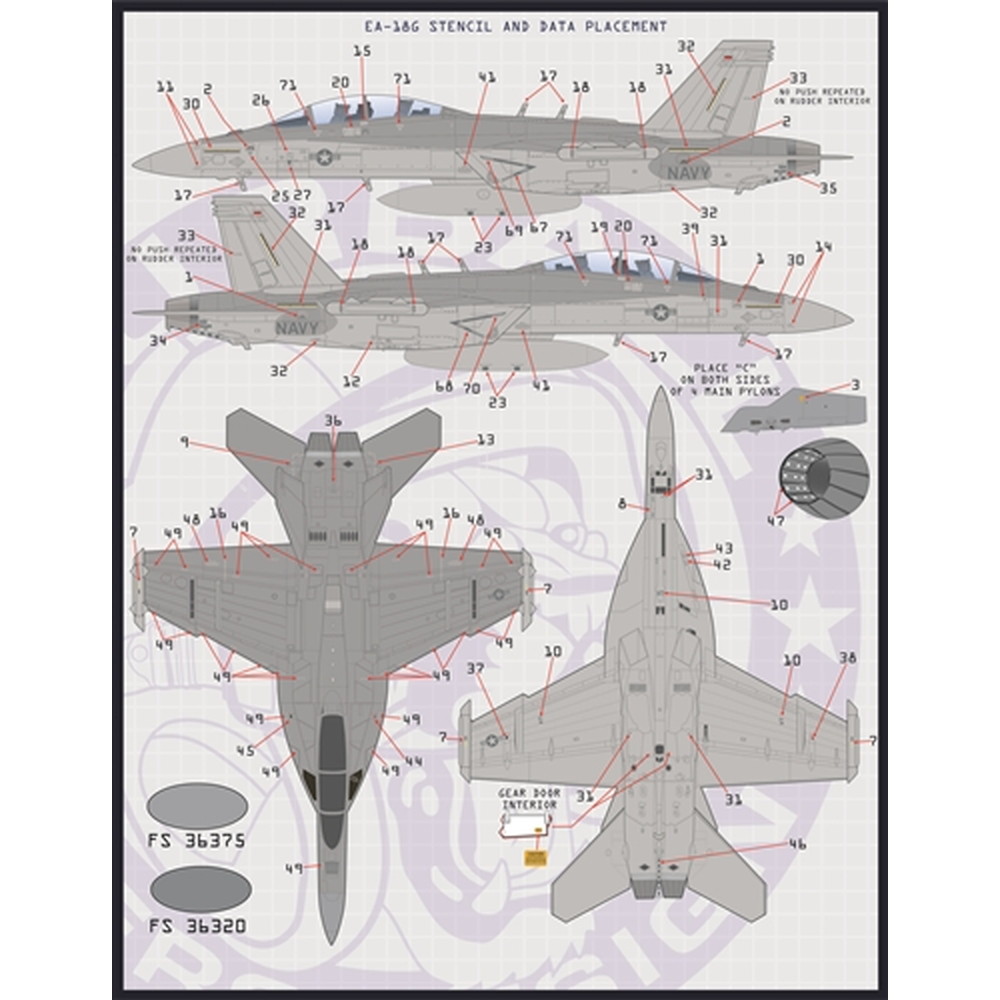 このセットではアメリカ海軍の主力戦闘機として1999年から運用が始められたアメリカ海軍の艦上戦闘攻撃機、F/A-18E/Fスーパーホーネット及びGグラウラーの機体各部に表記されているステンシルやデータのマークをすべて網羅しています。
