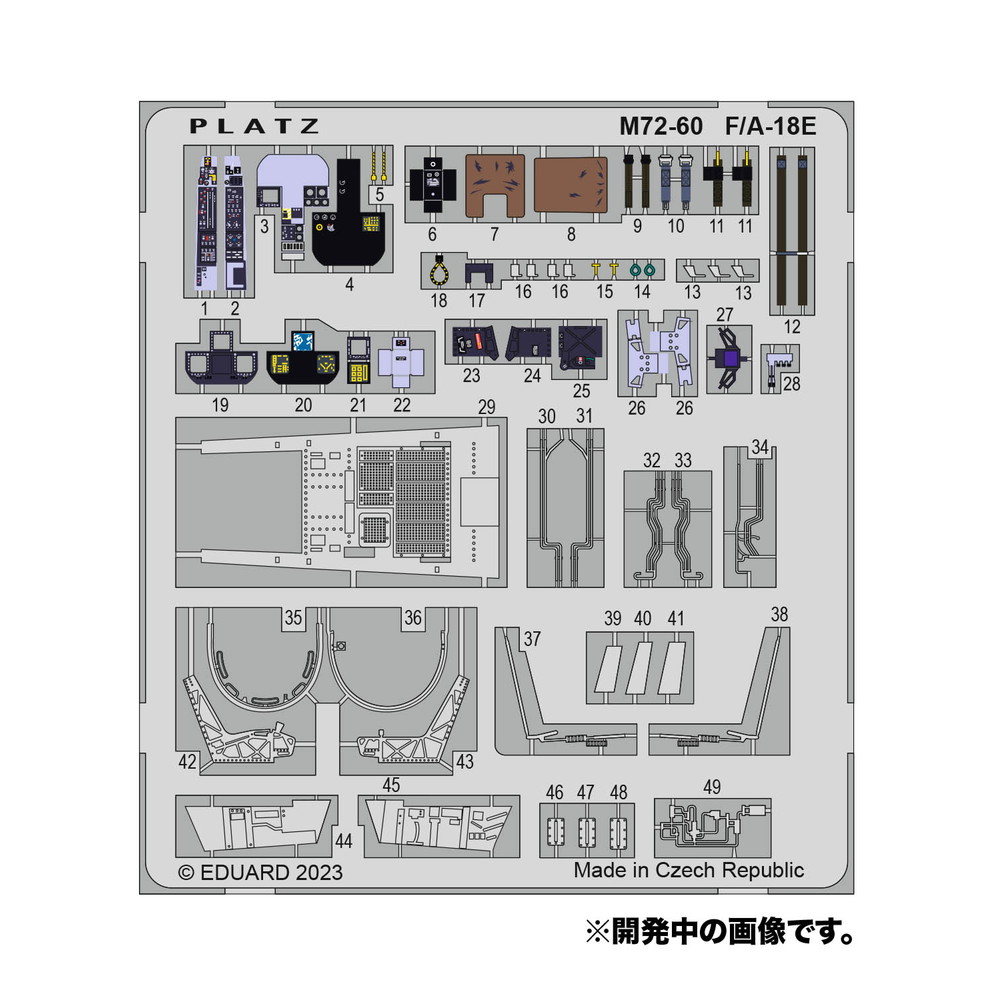 1/72スケールF/A-18Eキットの組み立てに、合わせてご利用ください。エッチングパーツは定評あるエデュアルド製。