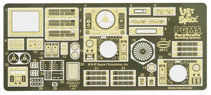 パラグラフィックスのディテールアップパーツセットはメビウスから発売された1/35スケール、仕上がりの直径約45cmのビッグサイズのジュピター2をリアルに仕上げるセットです。パーツにはジュピター2のリアルに再現されたインテリアをよりシャープに演出するエッチングパーツとデカールが用意されています。宇宙船の室内のウォールの表示やコントロールパネルのメーター類など、エッチングパーツとデカールがリアルに仕上がりを演出します。わかりやすい説明書も付属。