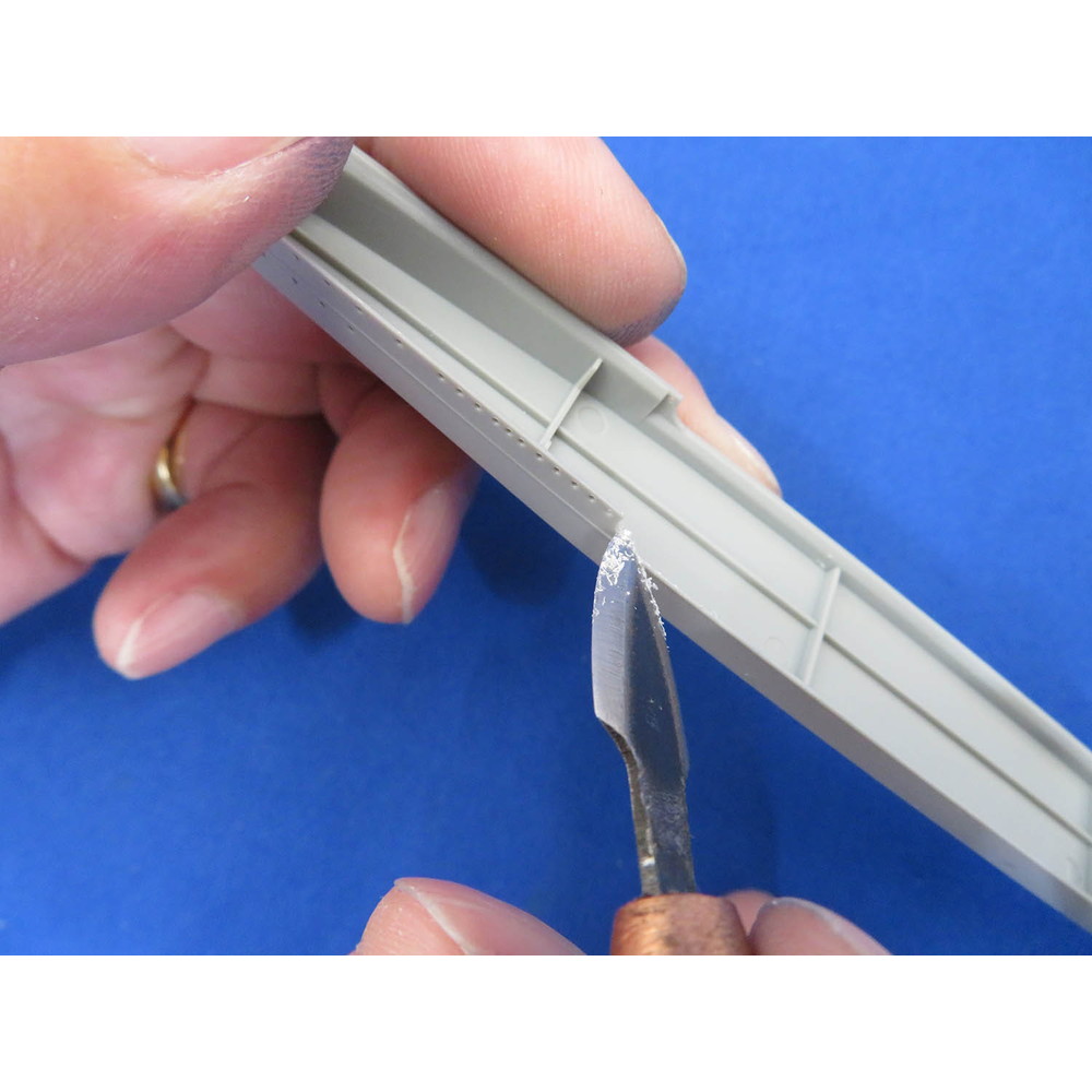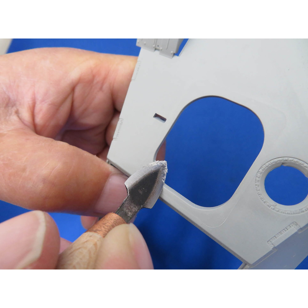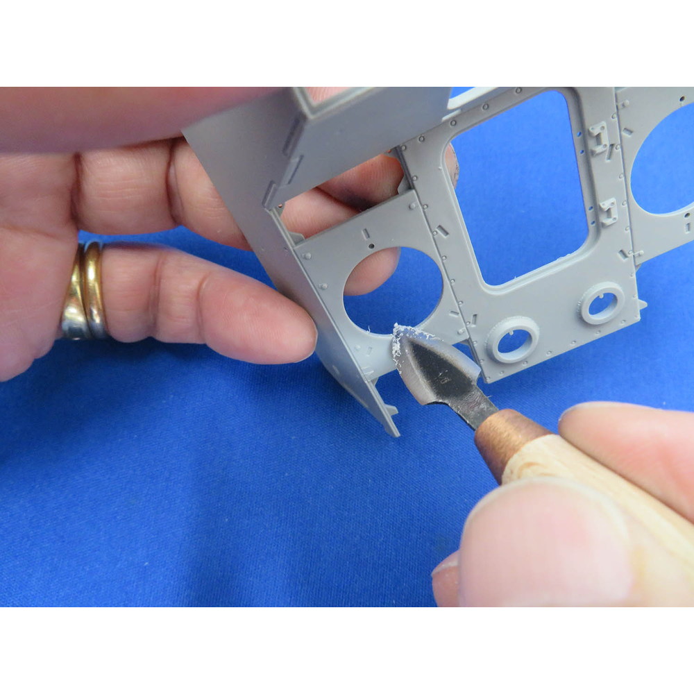 ●ヤスキ鋼「白紙二号」という高級ハガネを採用しているので切れ味も良く、ゲート処理から狭所のバリ取り,大きめのフィギュアの彫刻までオールマイティーな場面で使用できます。無論刃部は研ぐ事が可能です。