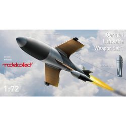 1/72スケールで第二次大戦中にドイツ軍が開発したミサイル、ルールシュタールX-4と空中投下式高性能爆弾、SC1000を再現したプラスチックモデル組み立てキットです。