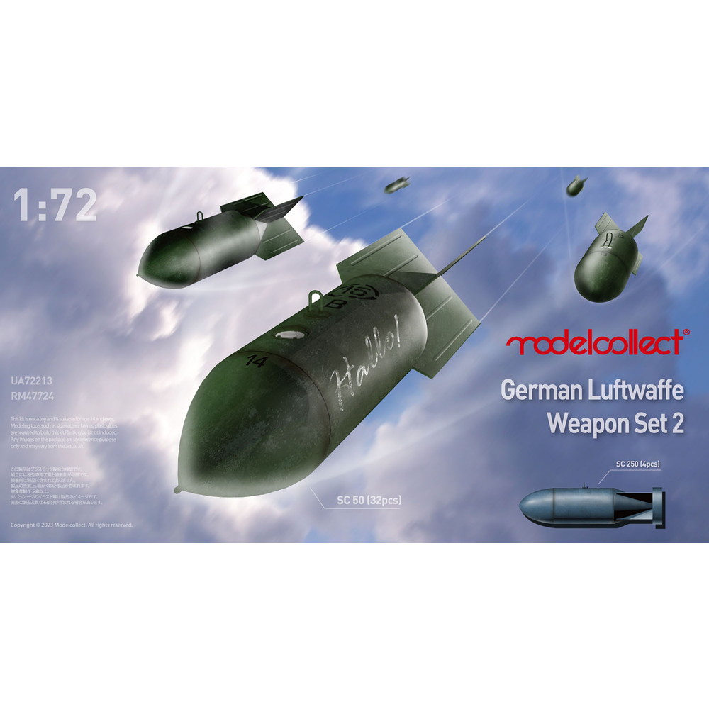 1/72スケールで第二次大戦中にドイツ軍が使用した爆弾、SC50とSC250を再現したプラスチックモデル組み立てキットです。