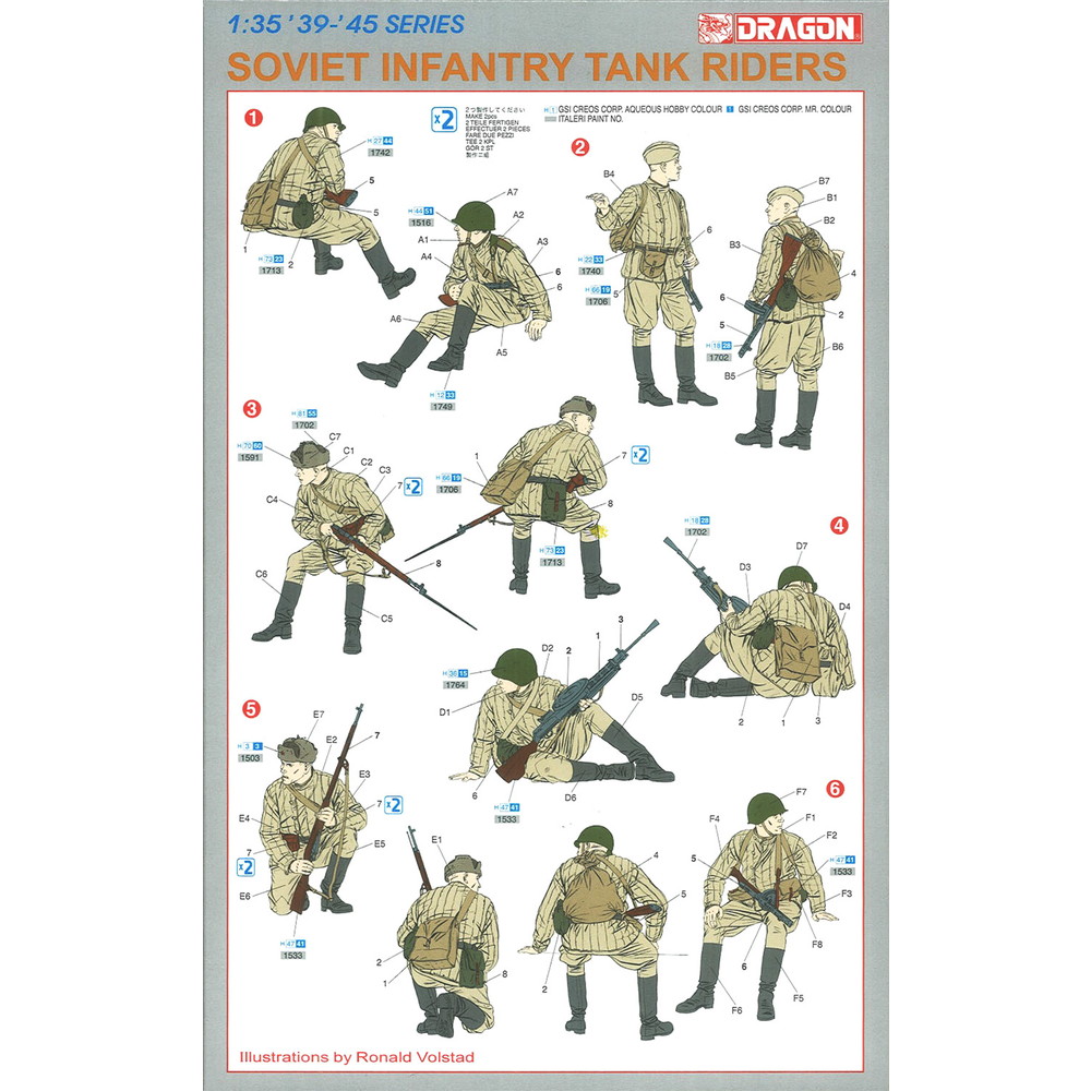 ■T-34戦車の車体に乗って移動中のソビエト軍歩兵を再現した6体セット