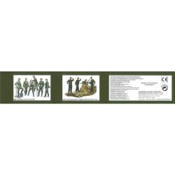 モデルはT-34戦車の車体に乗って移動中のソビエト軍歩兵を1/35スケールで再現した6体セットです。移動中とはいえ、戦場に向かう緊張感が漂うポーズのフィギュアはルパシカ型野戦服の上にチュラグレイカと呼ばれるキルティングの防寒着を着用し、足元はブーツを履いたスタイルでモデル化。頭部はヘルメット姿のほか、ウサンカ帽を被った兵士、ピロトカと呼ばれる略帽を被った兵士をそれぞれ再現しています。