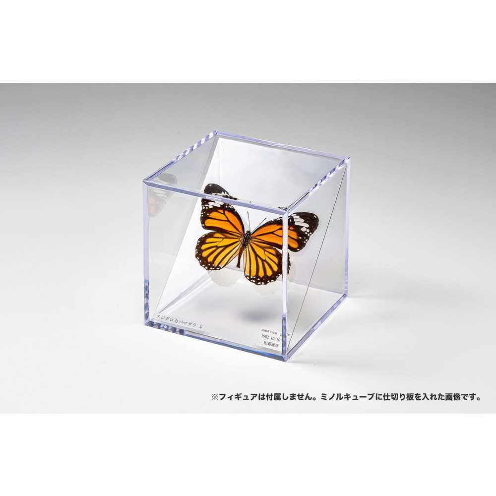 ●四角い透明ケースの中に斜めにセットされた仕切り板へ展示品をセットすることで、空中に浮いたような表現も可能