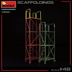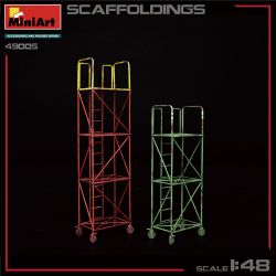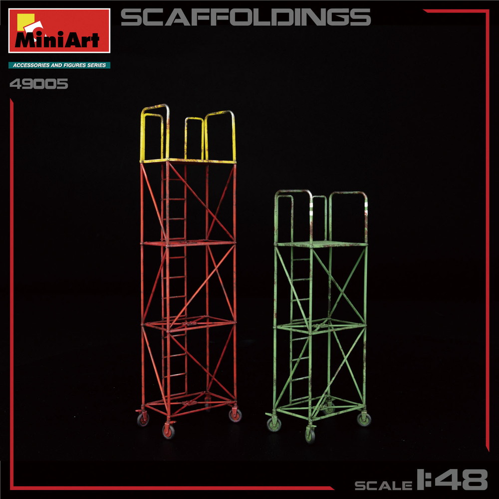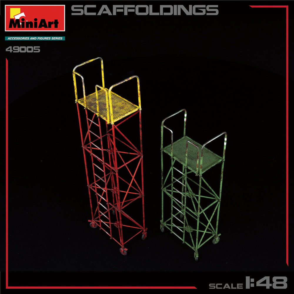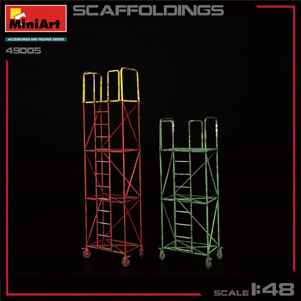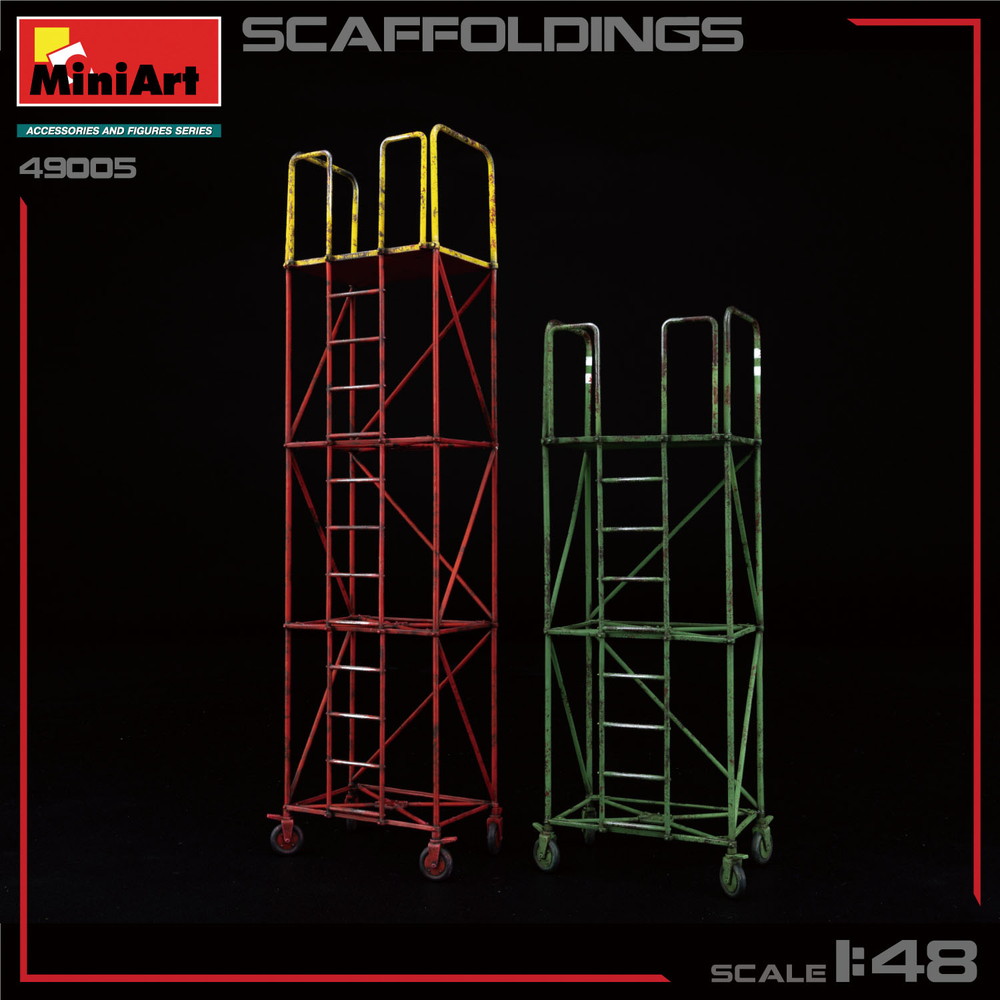 倉庫や工事作業現場などに見られる高所作業用足場を再現したプラスチックモデル組み立てキットです。