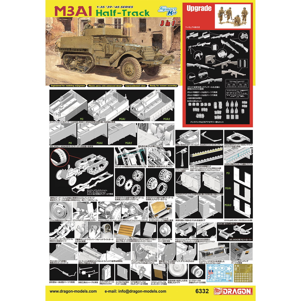 ●兵員輸送車M3ハーフトラックをM3、M3A1、M3A2の各タイプから選んで仕上げられる3in1キットとして再現