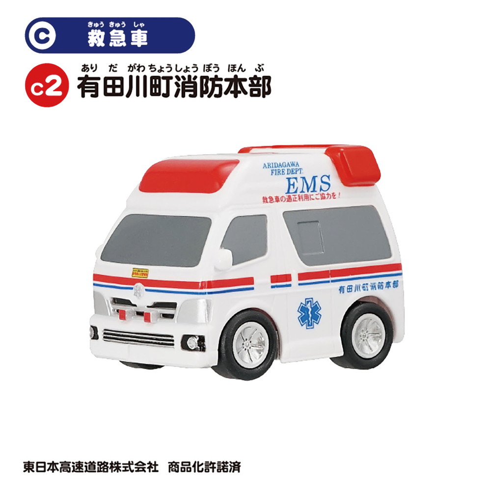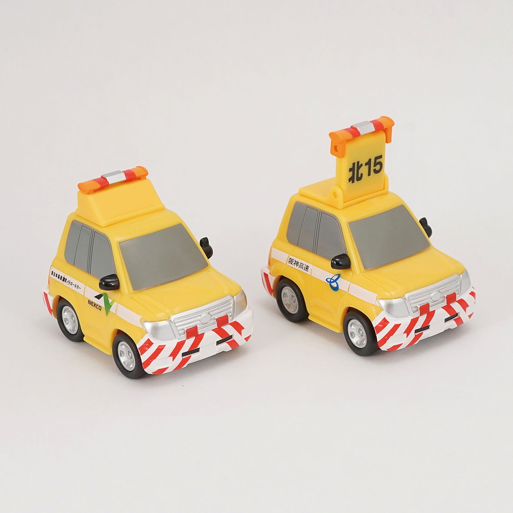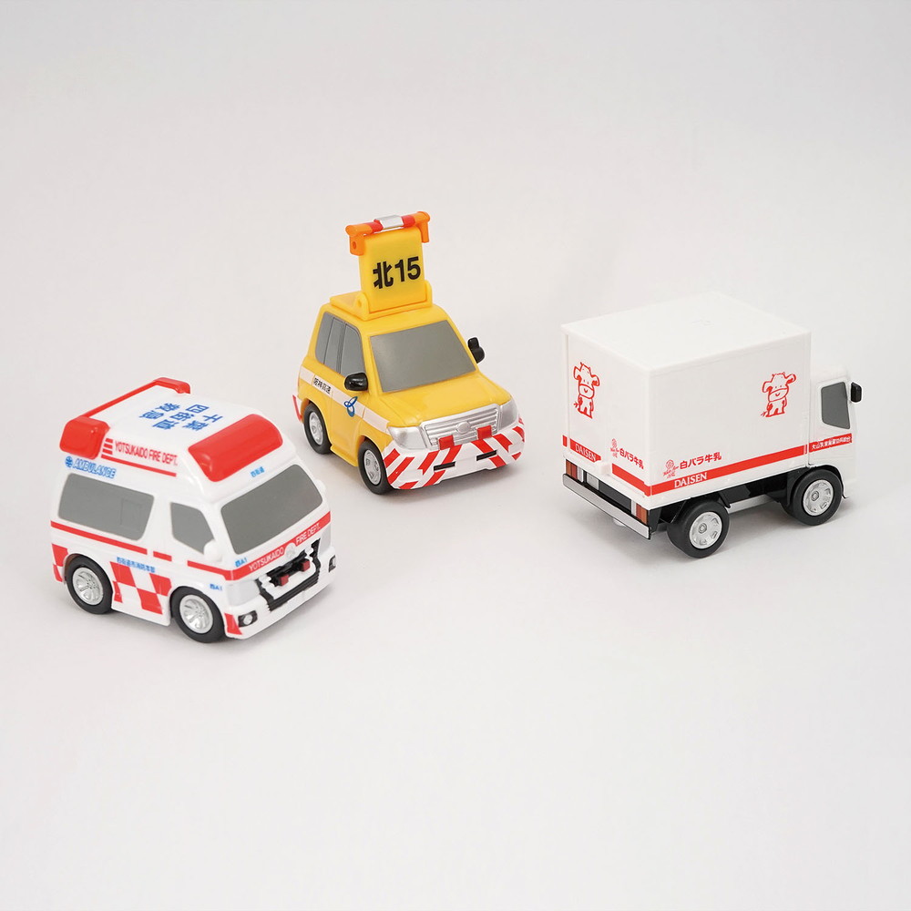 あそびかた:車をうしろに引いてから手をはなすと走り出すよ!
