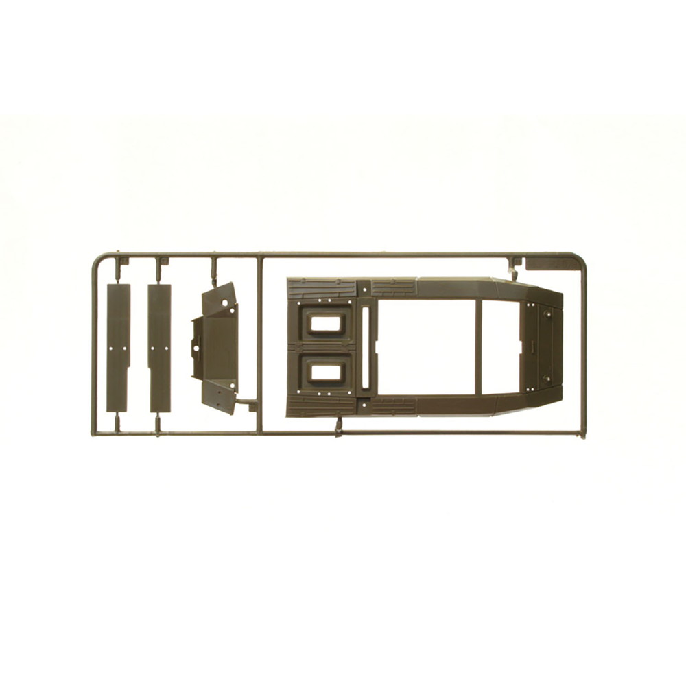 車体は一体成型パーツで再現、下面にはリーフスプリングのサスペンションから6輪駆動のドライブシャフトなどのメカニズムをモデル化。走行性能の高さも伝わってきます。