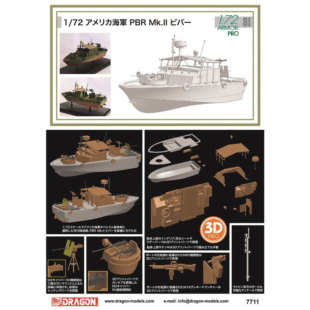 1/72スケールでベトナム戦争で活躍したアメリカ海軍の河川哨戒艇、PBRを再現したプラスチックモデル組み立てキットです。