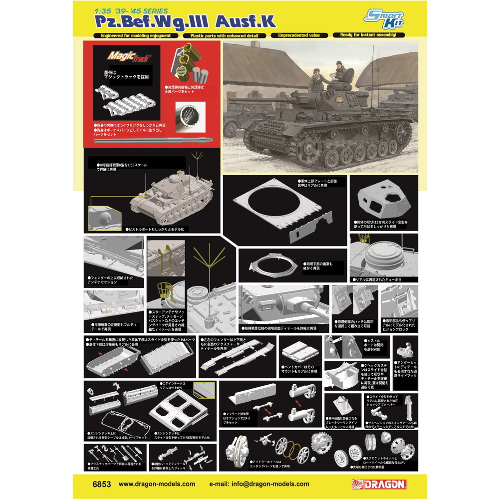 モデルは第二次世界大戦でドイツ軍が開発配備したIII号指揮戦車K型を1/35スケールで再現したプラスチックモデル組み立てキットです。