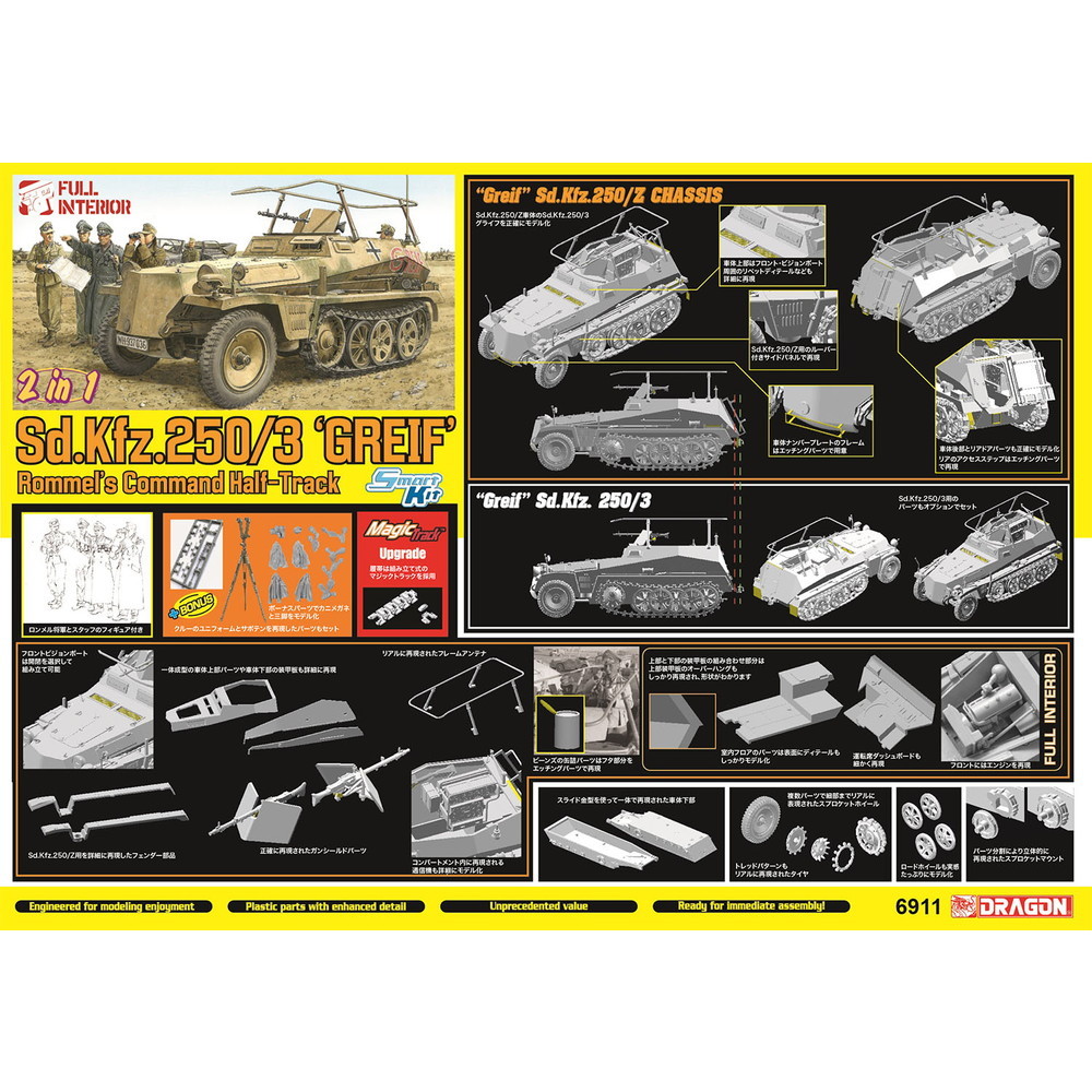 モデルはSd.Kfz.250/3無線指揮車タイプの北アフリカ戦線で活躍したロンメルが愛用した車両、グライフを1/35スケールで再現したプラスチックモデル組み立てキットです。