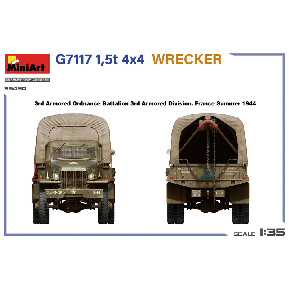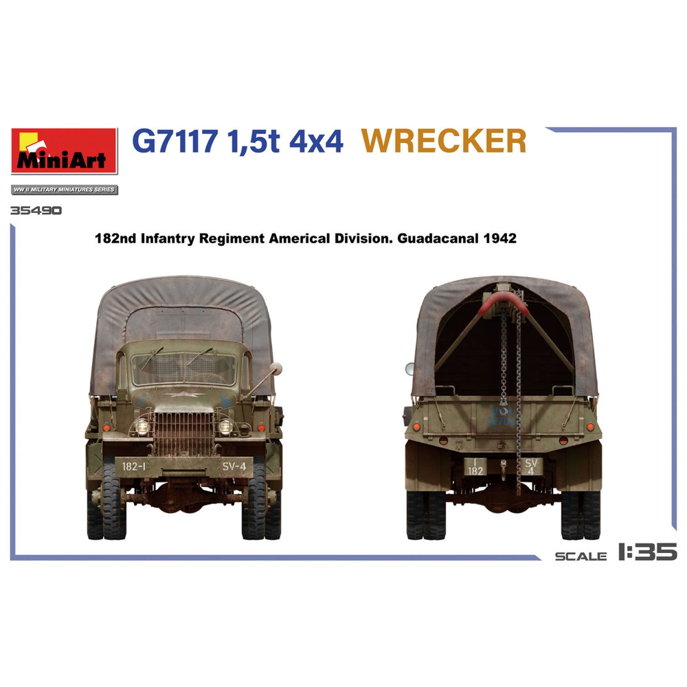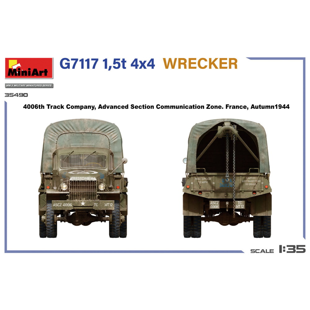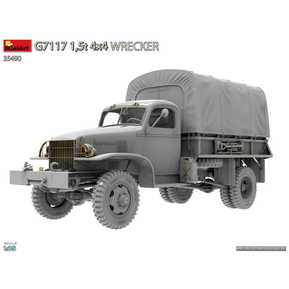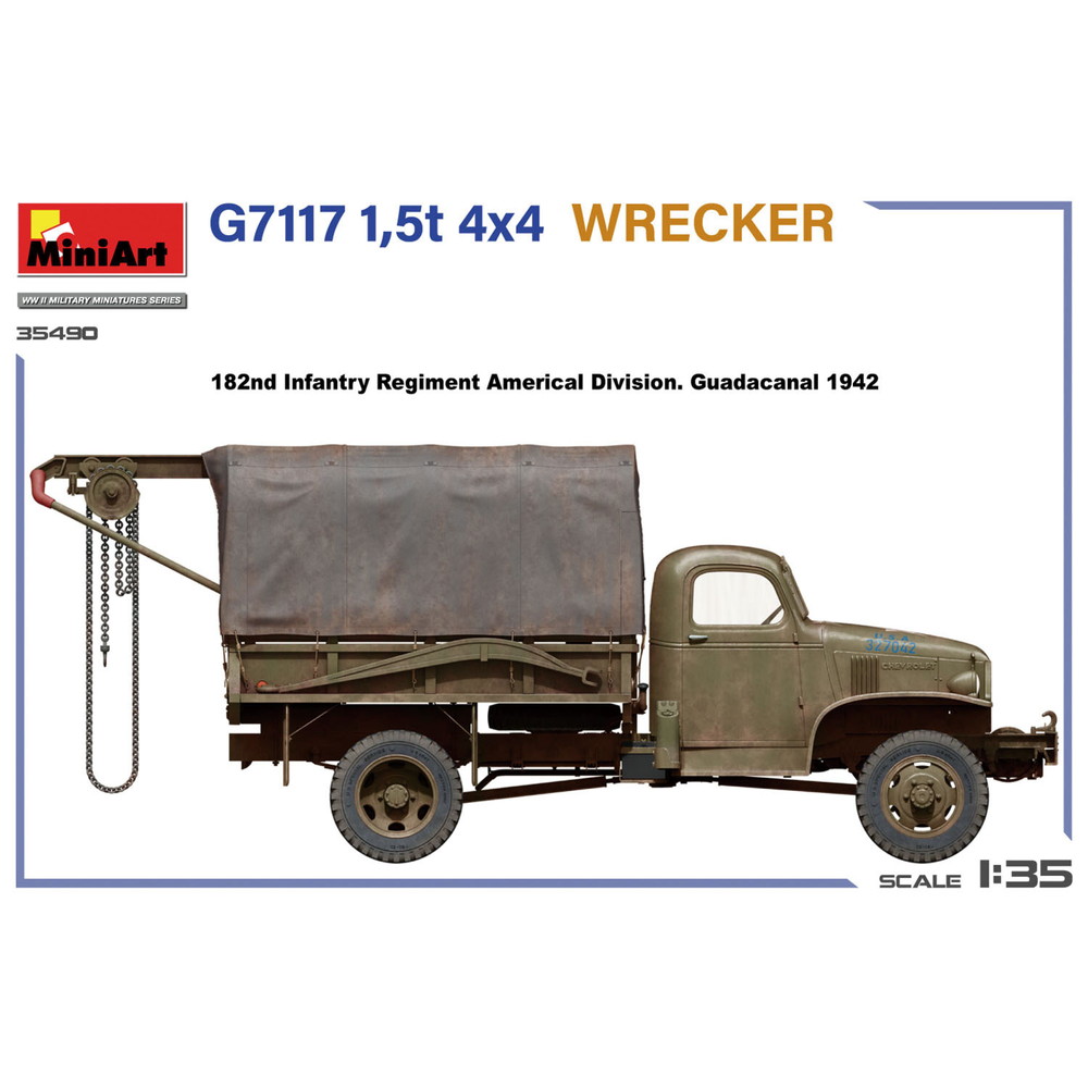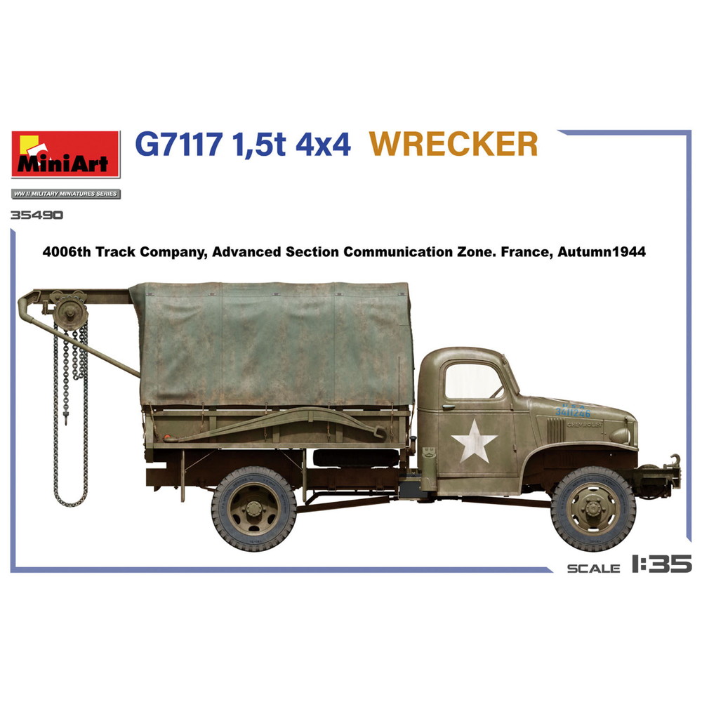 1/35スケールで第二次大戦のアメリカ軍が多数運用したトラック、G7117のレッカータイプを再現したプラスチックモデル組み立てキットです。
