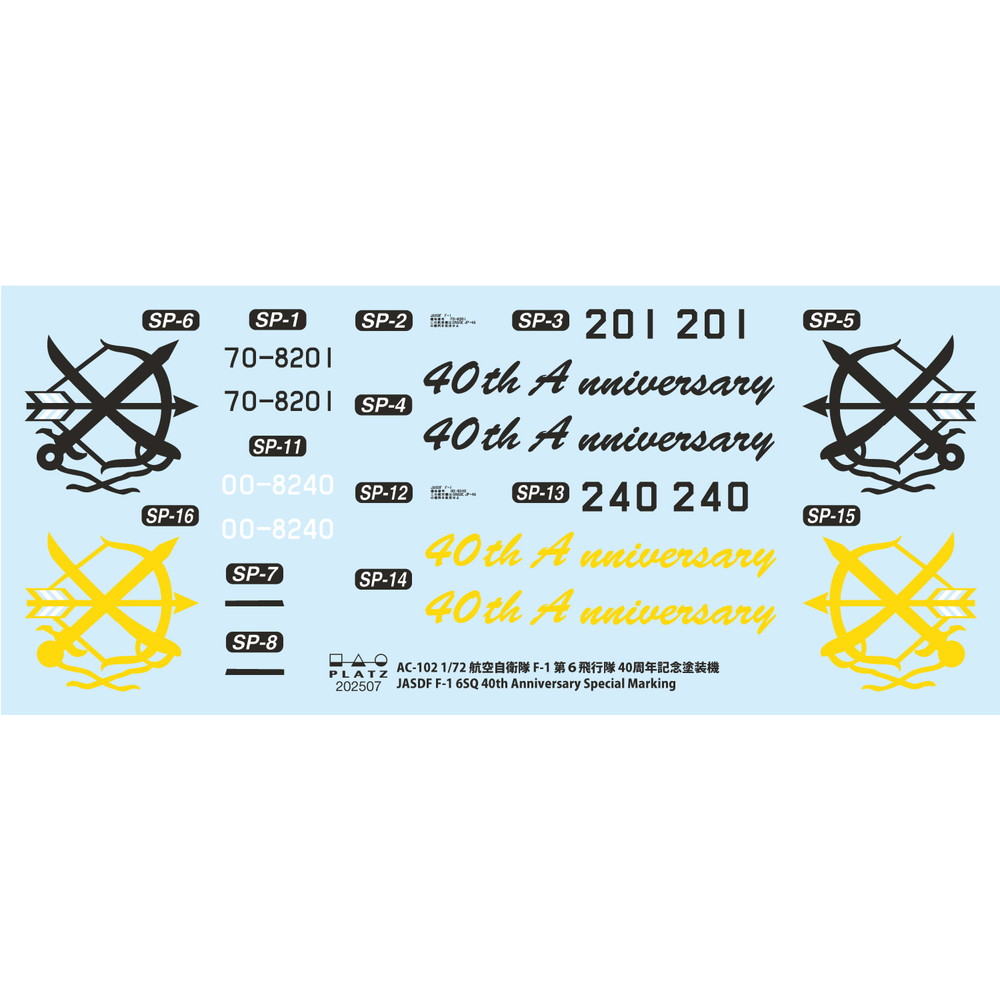このキットでは1999年に第6飛行隊が創設40周年を迎えたのを記念して特別塗装を施した機体番号70-8201、F-1の1号機をモデル化しています。