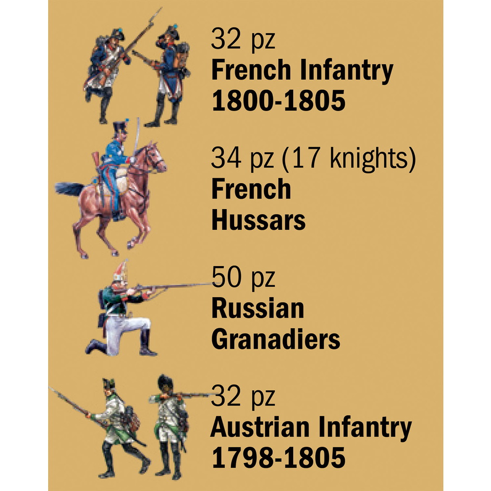 フランス軍歩兵は1800年から1805年当時の姿でオーストリア軍歩兵は1798年から1805年当時の姿をモデル化しています。