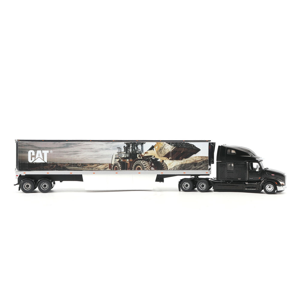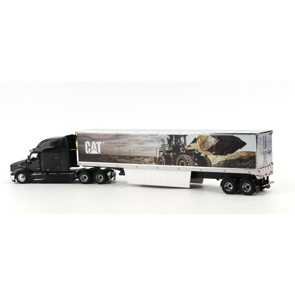 後部に連結するパネルトレーラーは左右のパネルにキャタピラー社のロゴマークとキャタピラー社がラインアップする大型ホイールローダーのイラストが描かれています。