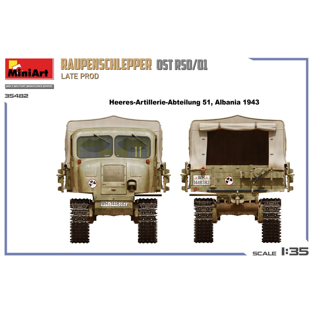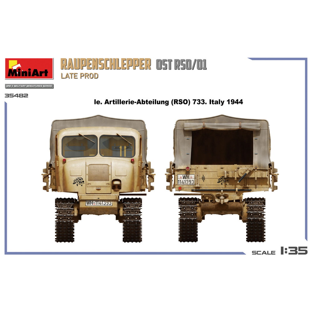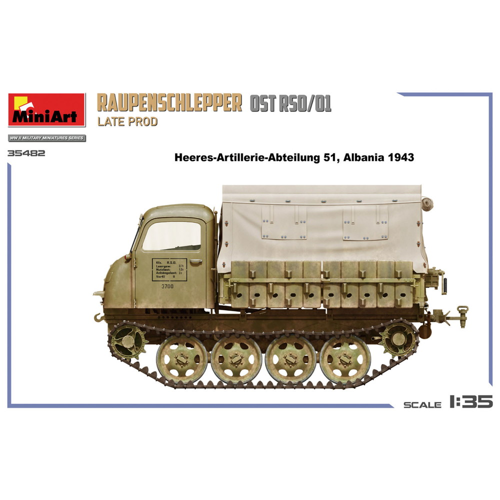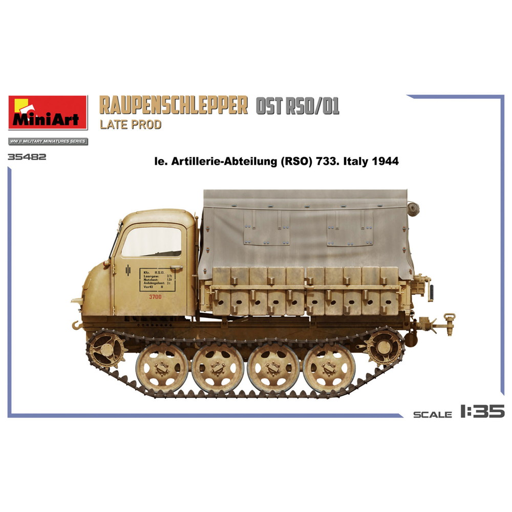 第二次世界大戦中、ドイツ軍が配備した装軌式トラクター、RSO/01の後期生産型を再現した1/35スケールのプラスチックモデル組み立てキットです。