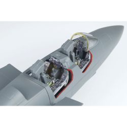 エッチングパーツは計器パネルやサイドコンソールパネル、シートベルトなどのコクピットに加え、機体各部のディテールを表現するパーツ、加えて駐機中に使用される車止めやエアインテークカバーとエンジンノズルのパーツも用意されています。