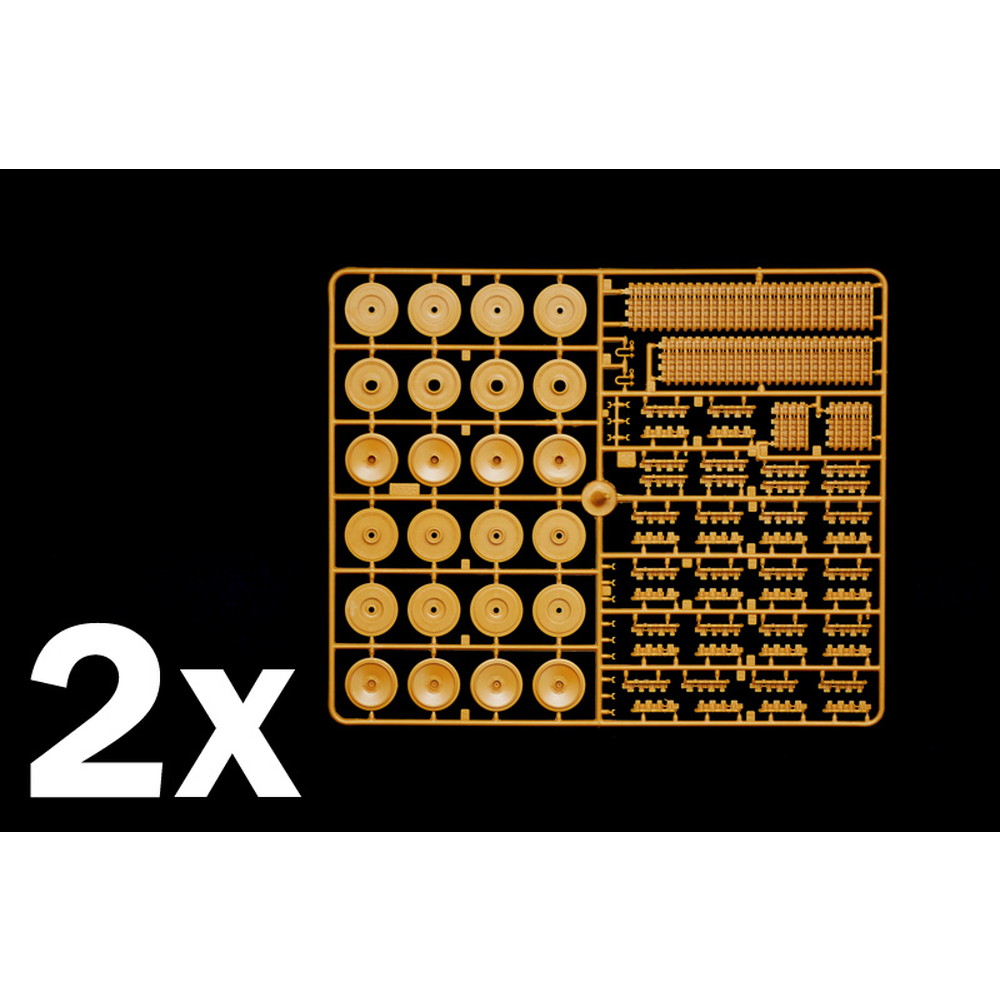 車体下部の足回りは千鳥レイアウトのロードホイールを一体でパーツ化。加えて履帯も上と下の2分割で再現。