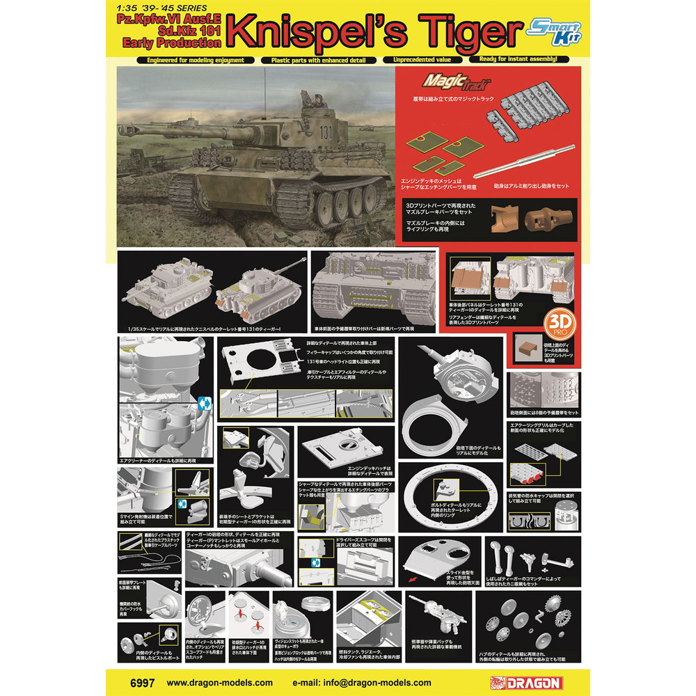 スケールは1/35。ティーガーI初期型をベースに東部戦線におけるクニスペルが搭乗したターレットの側面に「131」をマーキングした車両を詳細なディテールで再現しています。
