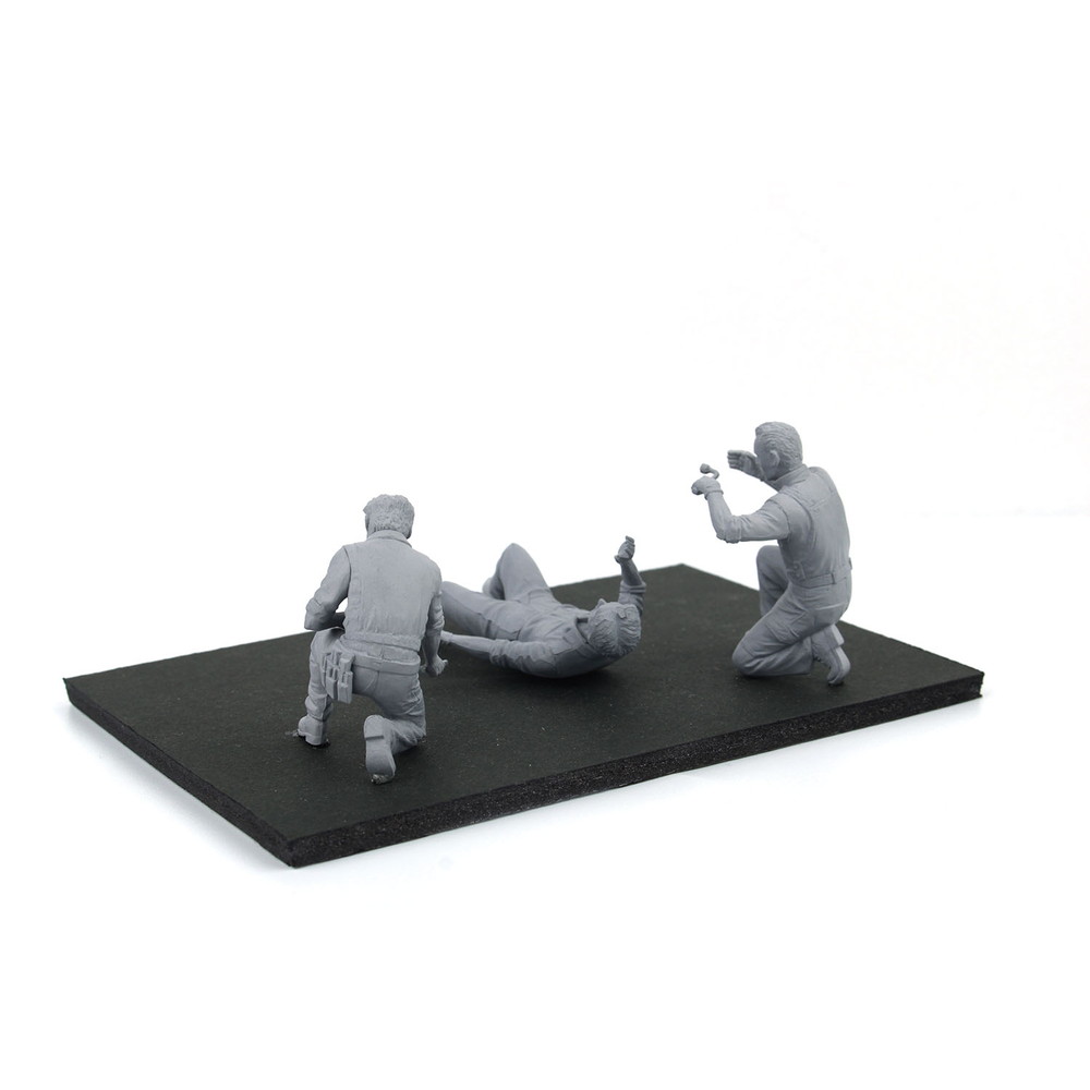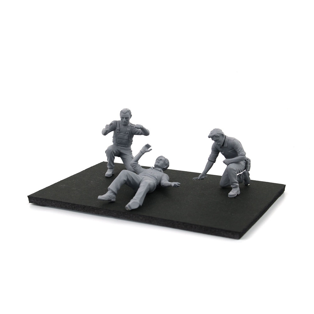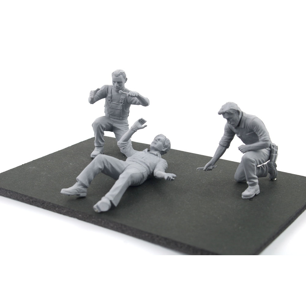 このセットでは街の自動車整備工場で作業するメカニックをモデル化。1/24カーモデルと組み合わせて楽しめるスケールで3体のうち1体は車の下に潜り込んで車体下面のチェックをする姿勢を再現しています。