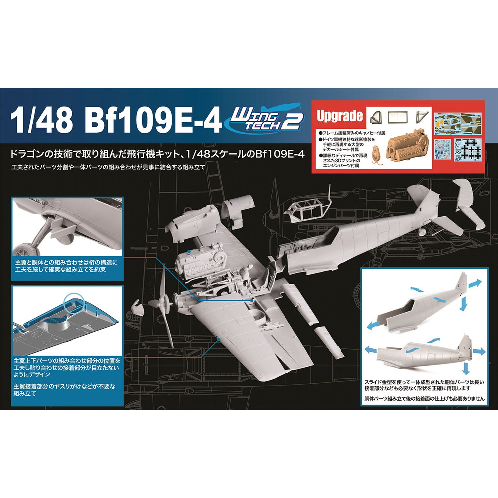 モデルは1/48スケールで第二次大戦のドイツ軍主力戦闘機、メッサーシュミットBf109を再現したプラスチックモデル組み立てキットです。中でもBf109E「エミール」タイプのE-4をモデル化しています。