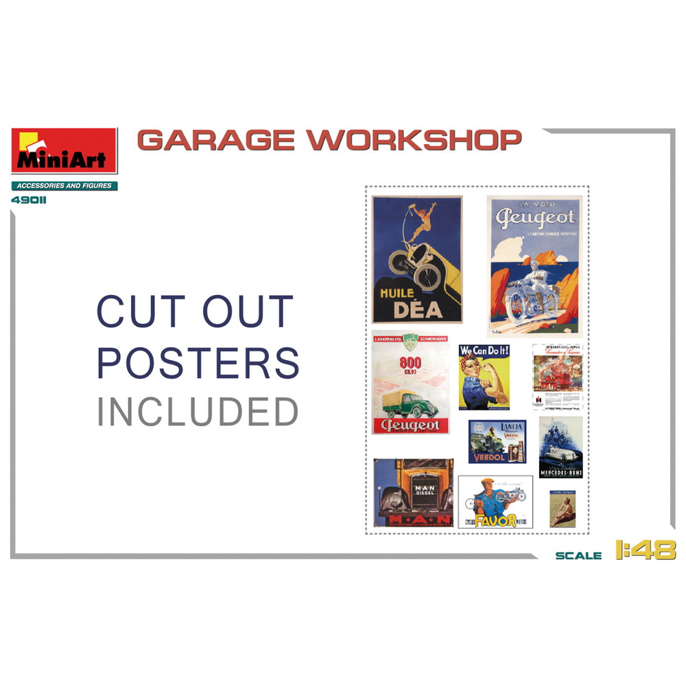 工具の実感を高めるエッチングパーツも付属。コンプレッサーやボンベ、あるいはオイル缶などに描かれたマークやもじなどはデカールで再現されています。加えてガレージの壁に貼られるポスターもパッケージにプリントされ、切り取って使用していただけます。