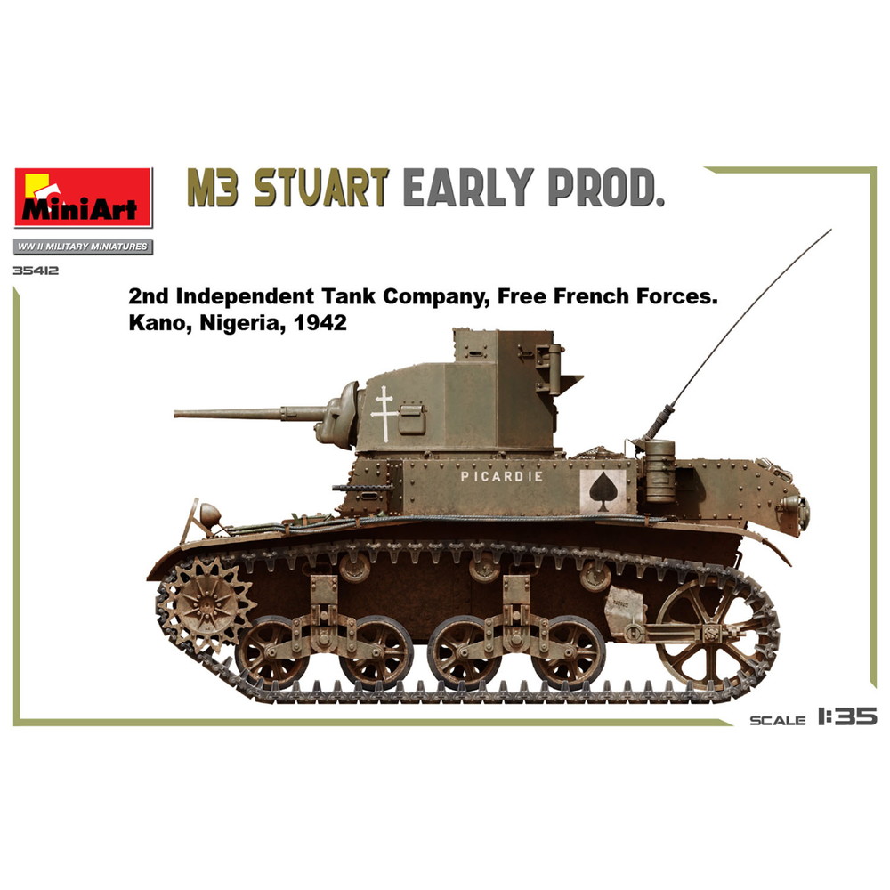 第二次世界大戦で活躍したアメリカの軽戦車M3スチュアートを再現した1/35スケールのプラスチックモデル組み立てキットです。