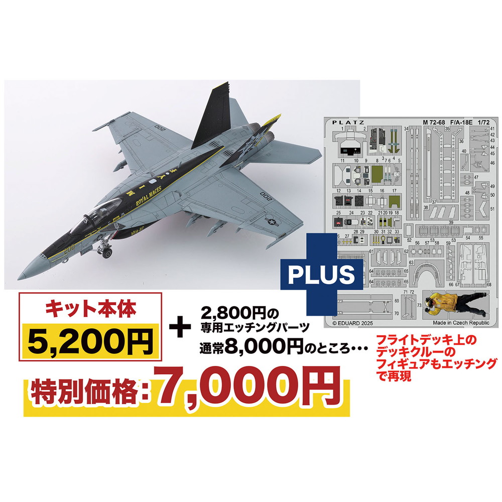 1/72スケールでアメリカ海軍の艦上戦闘機、F/A-18スーパーホーネットを再現したプラスチックモデル組み立てキットにこのキットではディテールアップ用のエッチングパーツセットを組み合わせたキットです。
