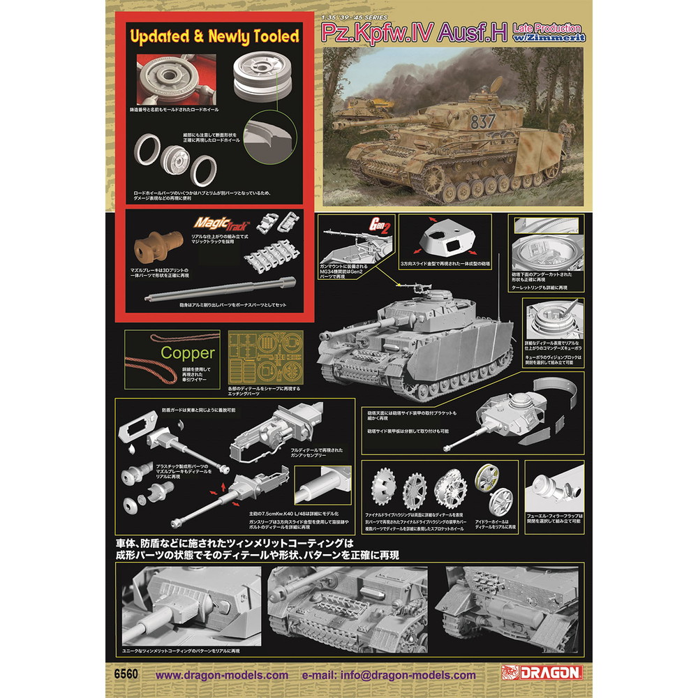 第二次世界大戦で活躍したドイツ軍の主力戦車、IV号戦車のH型を再現。モデルはH型の後期生産型を1/35スケールでモデル化、しかも車体には磁気吸着地雷除けに施されたツィンメリットコーティングを施した状態を再現しています。