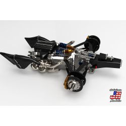カウルの下にはシャーシ、エンジンも再現。エンジンはシボレーのV型6気筒。ツインターボや補機類なども用意され、メカニカルな仕上がり。