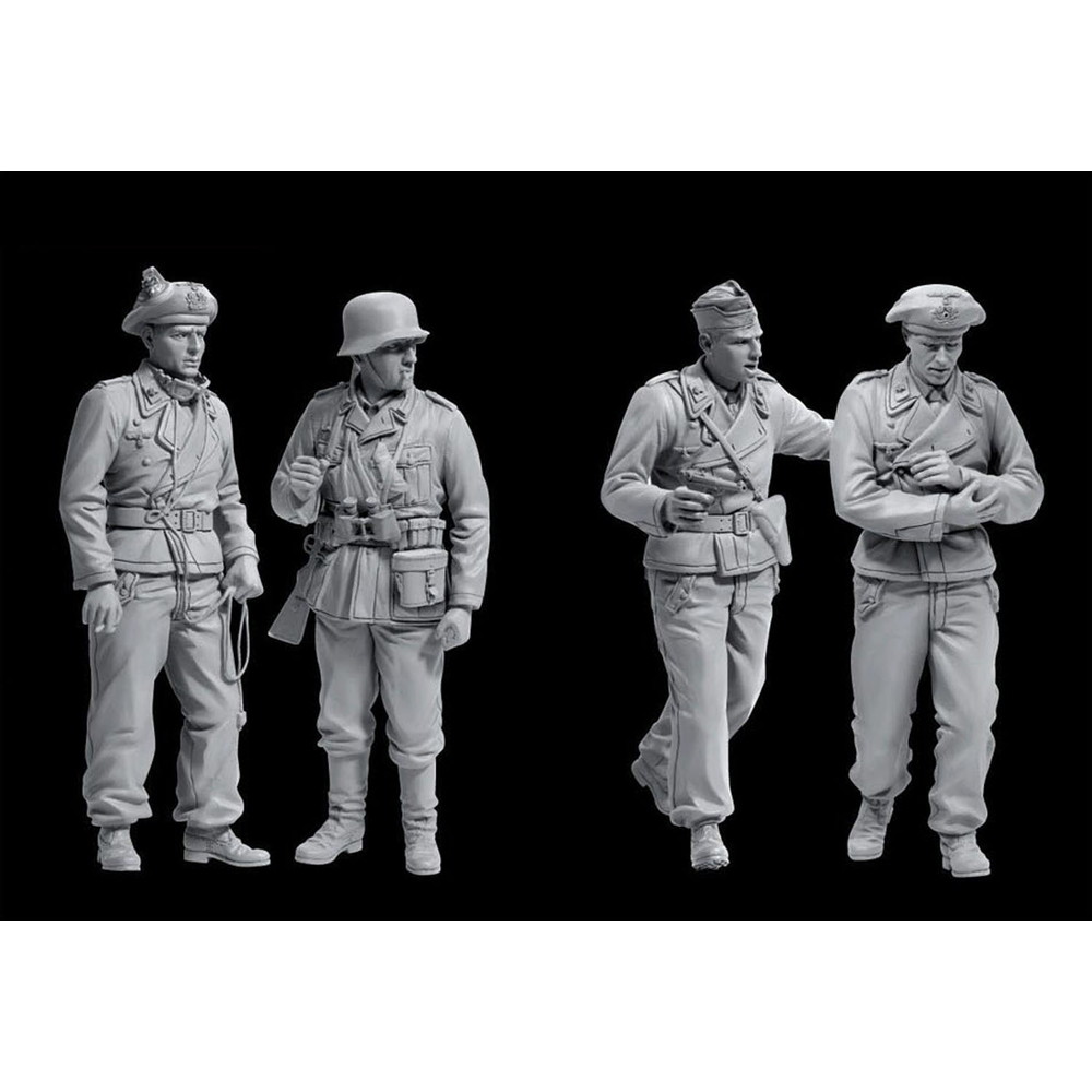 フィギュアは4体セット。3体は戦車兵、残りの1体は歩兵を再現しています。戦車兵の3体は黒軍服を着用し、帽子は2体がベレー帽、1体は略帽を被った姿でモデル化。そして、歩兵1体はM36野戦服に足元はブーツのスタイル。4体のフィギュアは2体づつの組み合わせでポージングされています。