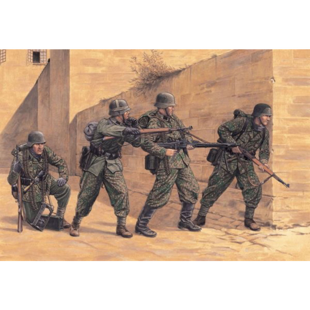 4体のフィギュアは物陰に身を隠しながら戦闘を展開する緊迫感あふれる姿でモデル化。M43野戦服の上に迷彩服を重ねたスタイル。服のしわなど自然な再現が施されています。くわえて、装備や銃器類は繊細でシャープな仕上がりが定評あるドラゴンのGen2シリーズのパーツをセット。仕上がりのリアリティを高めます。銃器はKar98k、MP40、MG42などをセット。自在に組み替えてみるのもいいでしょう。